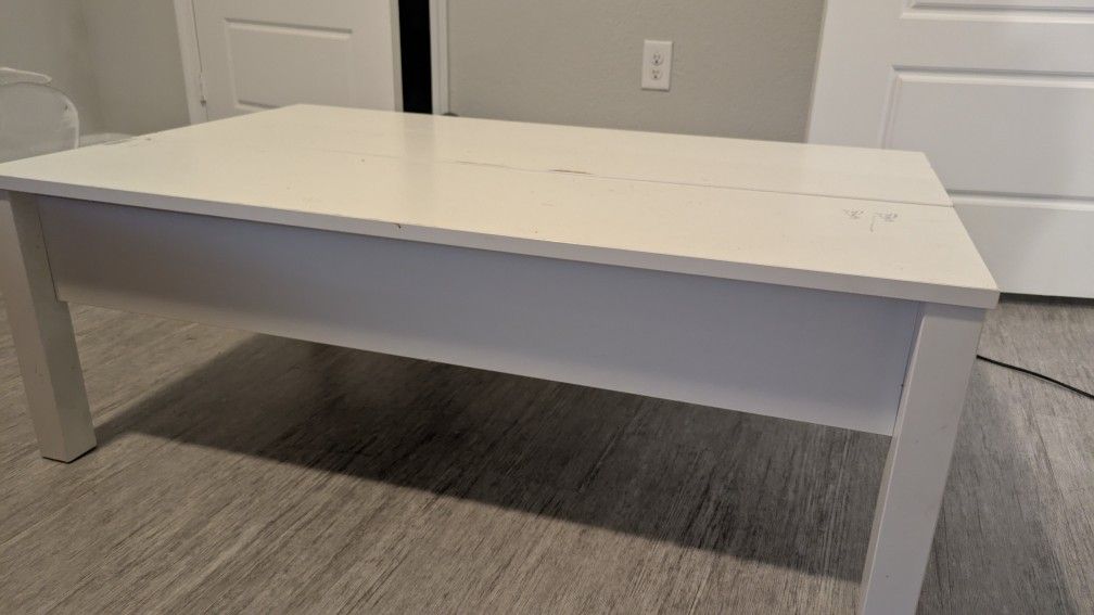 45"x 27.5"x 19" white coffee table with a split lift top. Has a spot on top and on the side where the paint was scratched, but overall still a solid table with storage space inside. ***Pick-up only