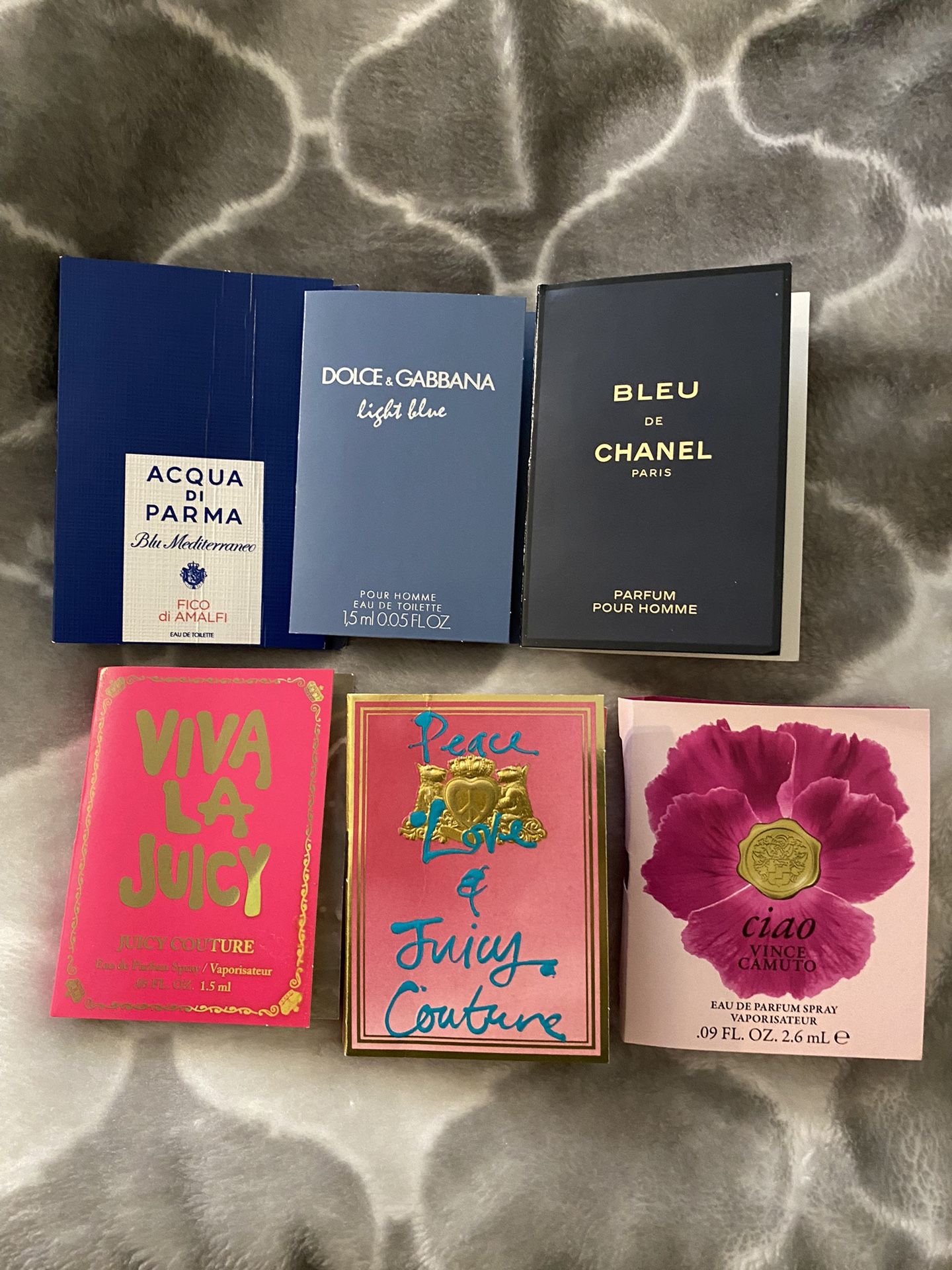 Vince Camuto Ciao 0.9oz 2.6ml Dolce Gabana light blue 0.05oz 1,5ml Juicy Couture Peace & Love 0.05 oz 1.5ml Juicy Couture Viva la juicy 0.05 oz 1.5ml Bleu de Chanel Paris 0.05oz 1,5ml