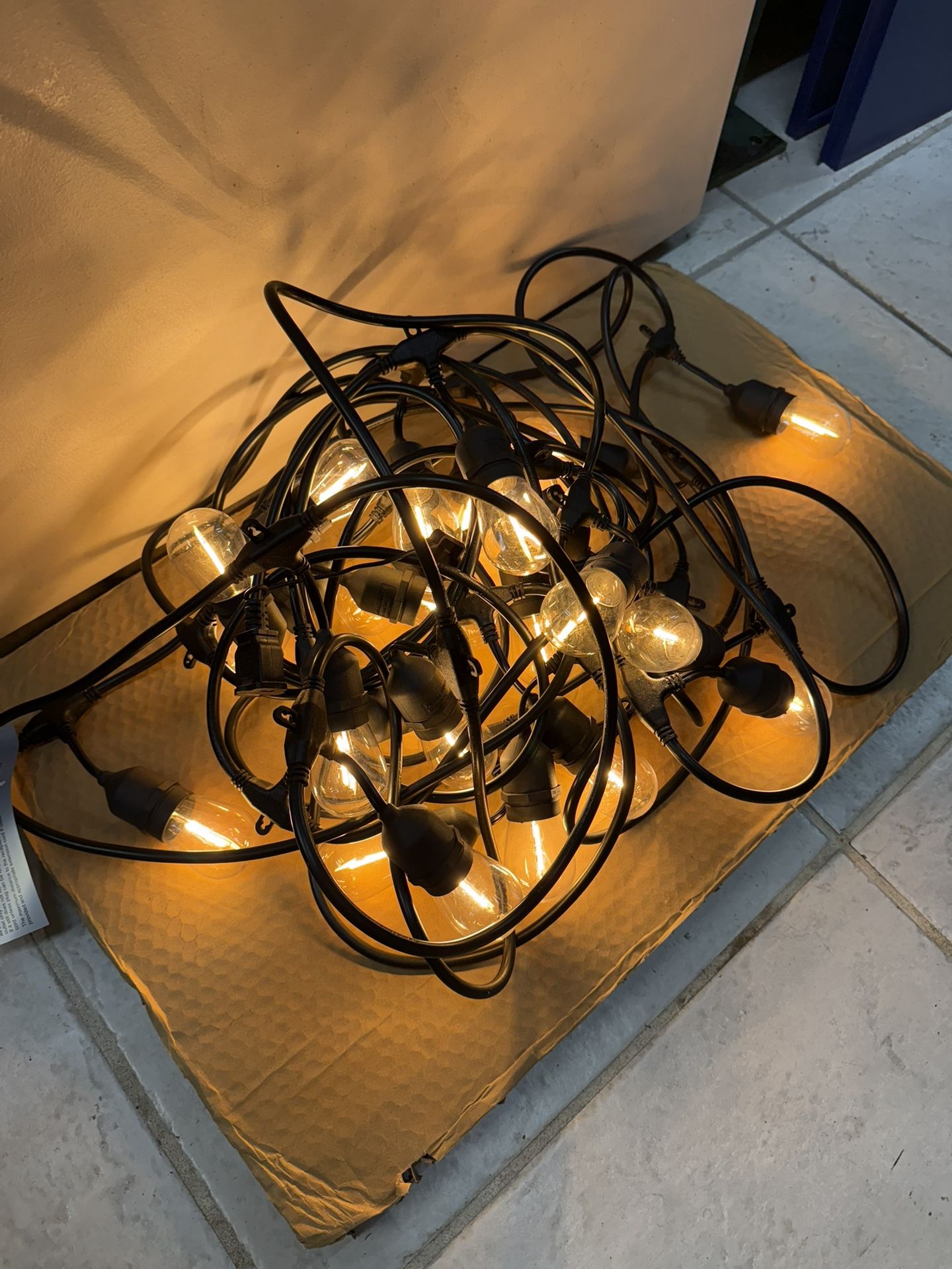 Package includes (1) light string with medium base (E26) socket, (24) S14 medium base (E26) single filament bulbs, (2) spare bulbs 24 single filament LED bulbs on a 48 ft. string State-of-the-art LEDs never need replacing and provide a lifetime of light Warm white light - 2200K Impact-resistant bulbs won't break when dropped, making them safe around children and pets Weatherproof design for long-lasting use Bulbs are spaced 2 ft. apart Flexible mounting options (mounting hardware not included) Tested and approved for safety