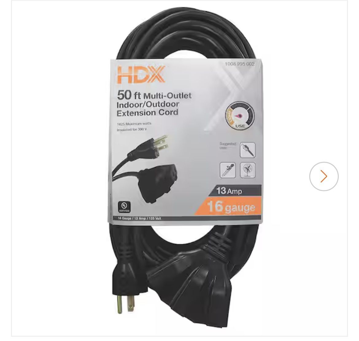 HDX 50 ft. 16/3 Light Duty Indoor/Outdoor Extension Cord with Multiple Outlet Triple Tap End, Black $15