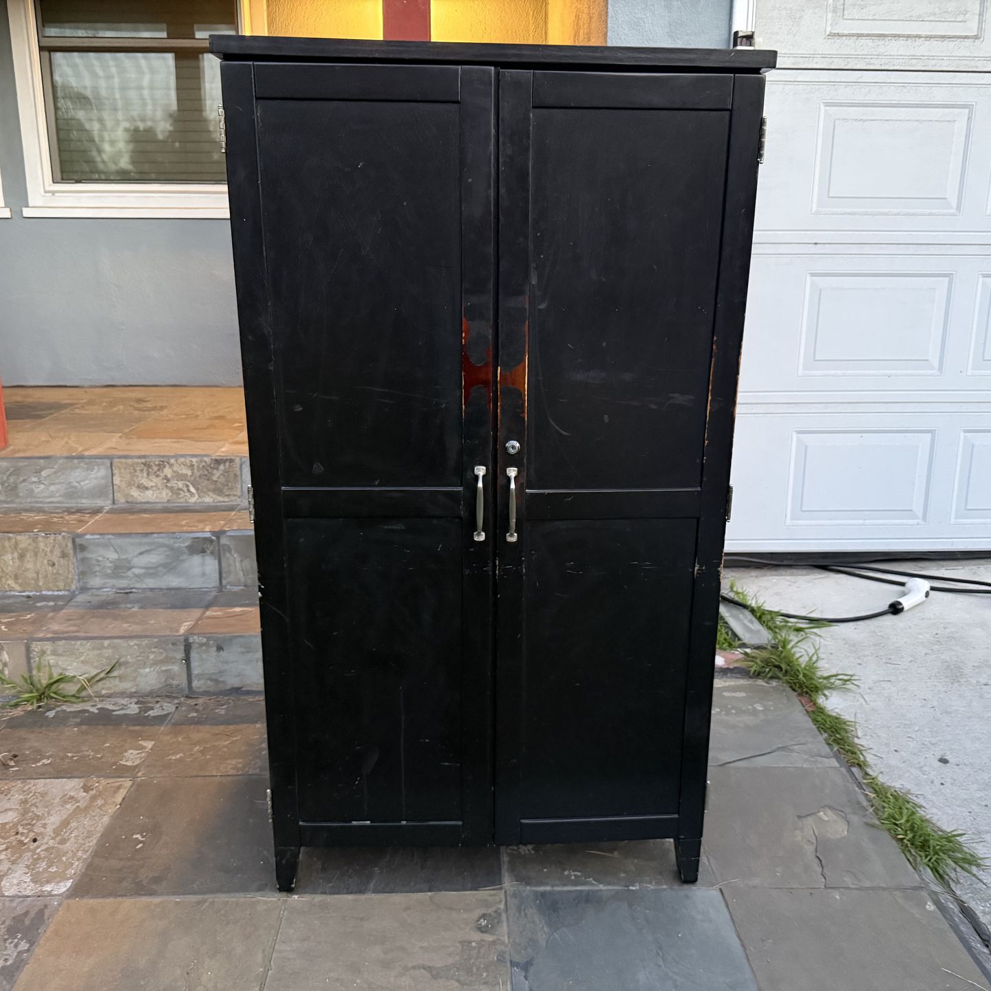 Black Computer Desk Armoire Approximately 31” wide x 57” tall x 21.5” deep The desk has a dry erase board (old markers & erasers included) with storage on one side and a Bulletin Board on the other side. It also has a filing cabinet and storage cubbies on the top. The desk probably needs a new coat of paint. We have had it for many years. Pickup in West LA (90066)