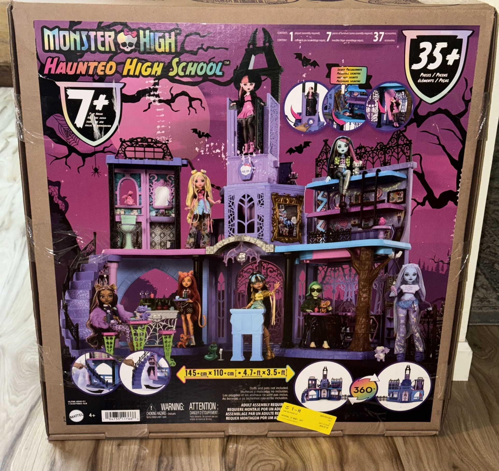 The Monster High Haunted High School doll house is the skulltimate place for everyone's favorite boos to fang out! It has over 7 play areas like a dorm room, bathroom, creepateria, and classroom, including multiple surprise transformations! Whether hitting the books in study howl or brewing up some fun in the potion corner, there are so many scary fun stories to tell with the Haunted High School. It makes an unforgettable gift for kids ages 4 years old and up! Dolls not included. Colors and decorations may vary. Monsters and mystery await at the Haunted High School playset! This screamium doll house features 360-degree play, multiple surprises, and 35+ storytelling pieces for bone-chilling adventures. Discover the chilling charms of Monster High via 7+ play areas including a creepateria, classroom, bathroom, and bedroom that sleeps up to 3 dolls. Surprises await! Swivel the staircase to reveal the hidden potion room, then find the 2 secret passageways for secret slide and trapdoor transformations. One of the secret passageways features a slide! Place a doll in the tower and twist the knob to send them sliding right onto a bunkbed in the dorm room. Late for biteology 101? Push the alarm clock next to the bed to drop a doll into class 1 floor below, trapdoor style! After class, flip the chandelier and podium to turn the entry into a disco party! Accessories like desk chairs, creepateria dining furniture, and fangtastic food and drink pieces will inspire all sorts of spooktacular stories.