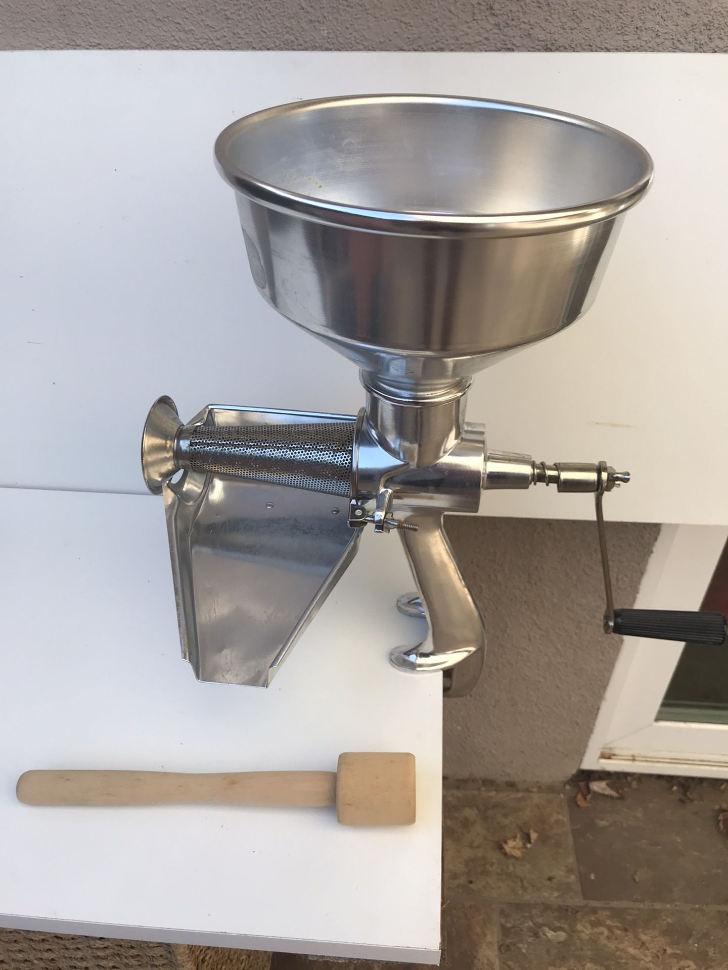 Vintage original all-metal Squeezo Strainer with original box and recipe manual Used to puree tomatoes, apples, pumpkins, squash, berries and more