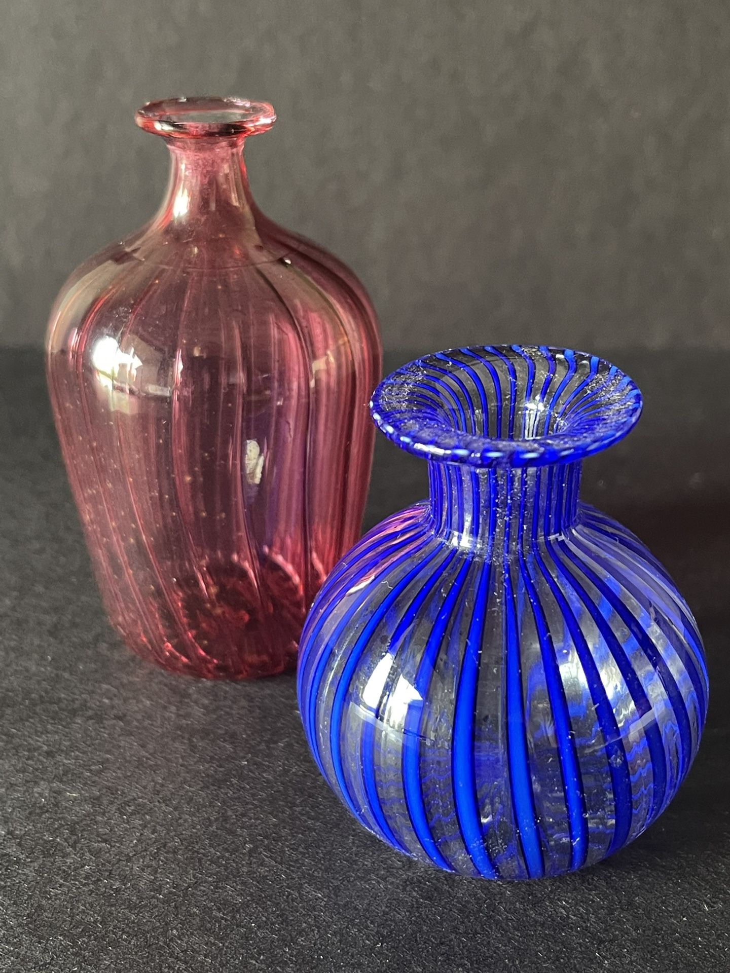 Tommasi Vintage Mid Century Modern Italian Murano perfume bottles. One blue and one red Perfume Bottle WITHOUT Stoppers. The blue Tommasi is 2 1/4” X 2 1/4” the red Tommasi is 3 1/4” X 2 1/4”. No Chips or Cracks.