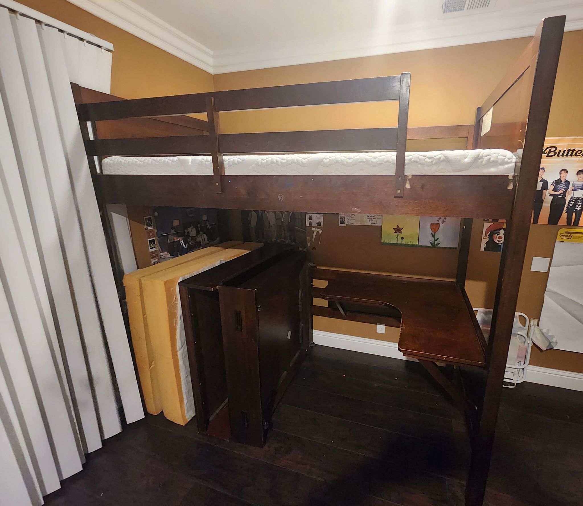 Selling loft bed with a desk under. Comes with mattress. Items are washed It’s a solid bed Will need a truck 200 obo