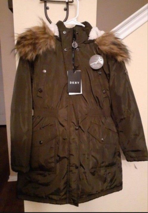 New With Tags Size Large DKNY Faux Fur Olive Green winter Coat In JUSTIN Great Christmas Gift