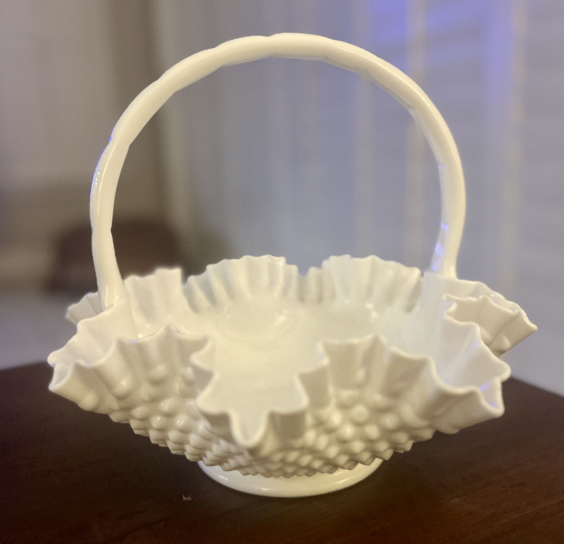 This vintage Fenton basket is a stunning piece of decorative pottery made of milk glass. Standing at 10 1/2" tall & 11 1/2” wide with a hobnail pattern and ruffled edge design. This white glass basket is a beautiful addition to any collection. Originating from North America, this production style of milk glass is truly unique and elegant, making it a standout piece for collectors of pottery and glassware.