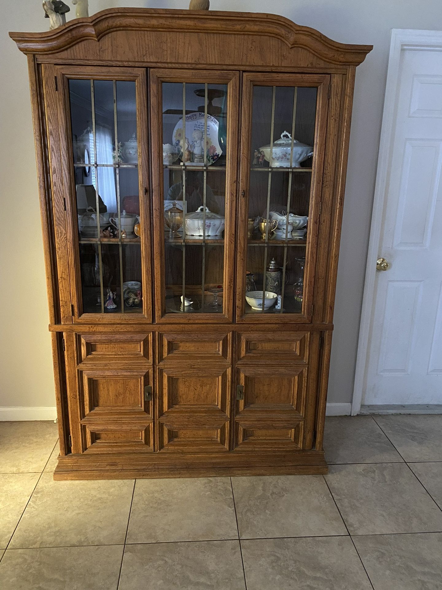 LOCATED IN DEER RUN CASSELBERRY 32707 PICK UP ONLY LOCATED IN DEER RUN CASSELBERRY 32707 PICK UP ONLY Vintage 1977 or 1978 China cabinet, solid oak Three glass panels, two of them are doors. Three glass shelves. Two doors underneath with two shelves. Dimensions H 6’ 6” W 4’ 1” D 14 1/2” LOCATED IN DEER RUN CASSELBERRY 32707 PICK UP ONLY LOCATED IN DEER RUN CASSELBERRY 32707 PICK UP ONLY