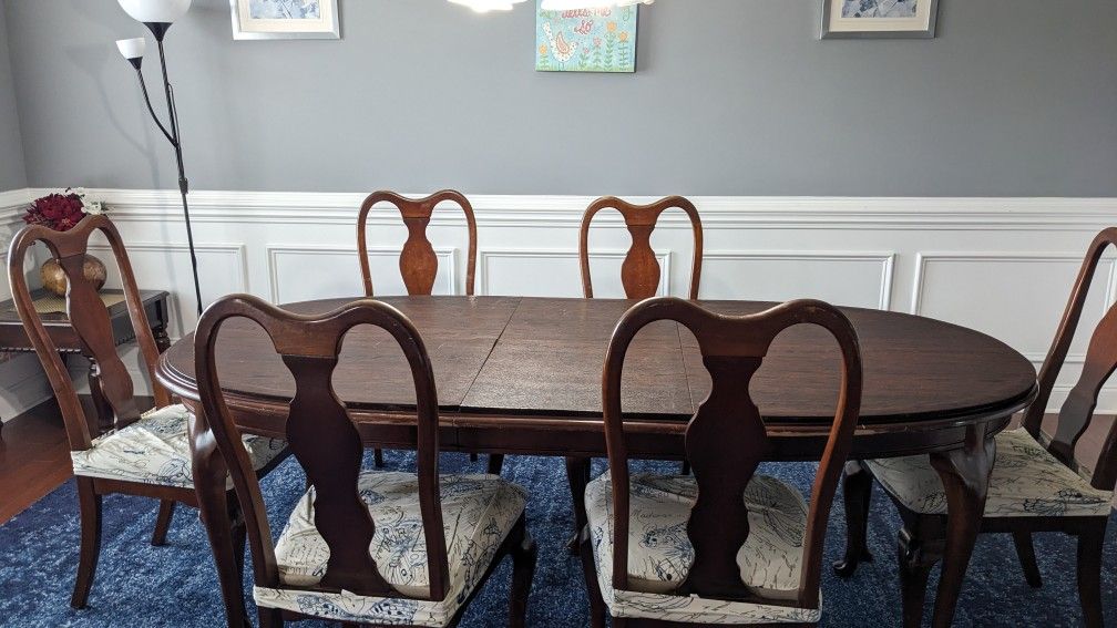 Mahogany wood dining table with 6 chairs. It's very sturdy and strong. It has leaf inserted for extension.