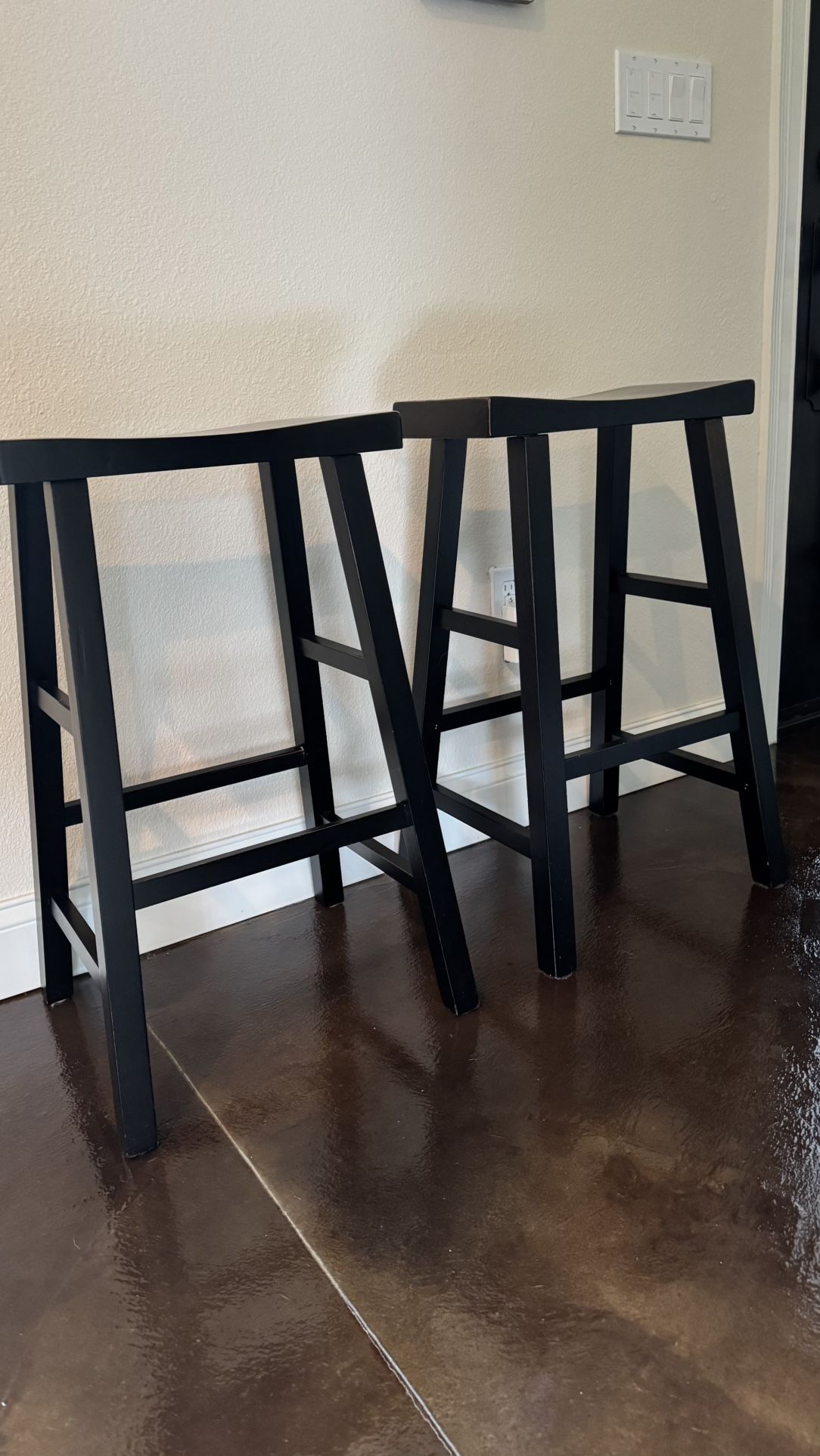 Two farmhouse bar stools Color: rustic black If the ad is up, the stools are available