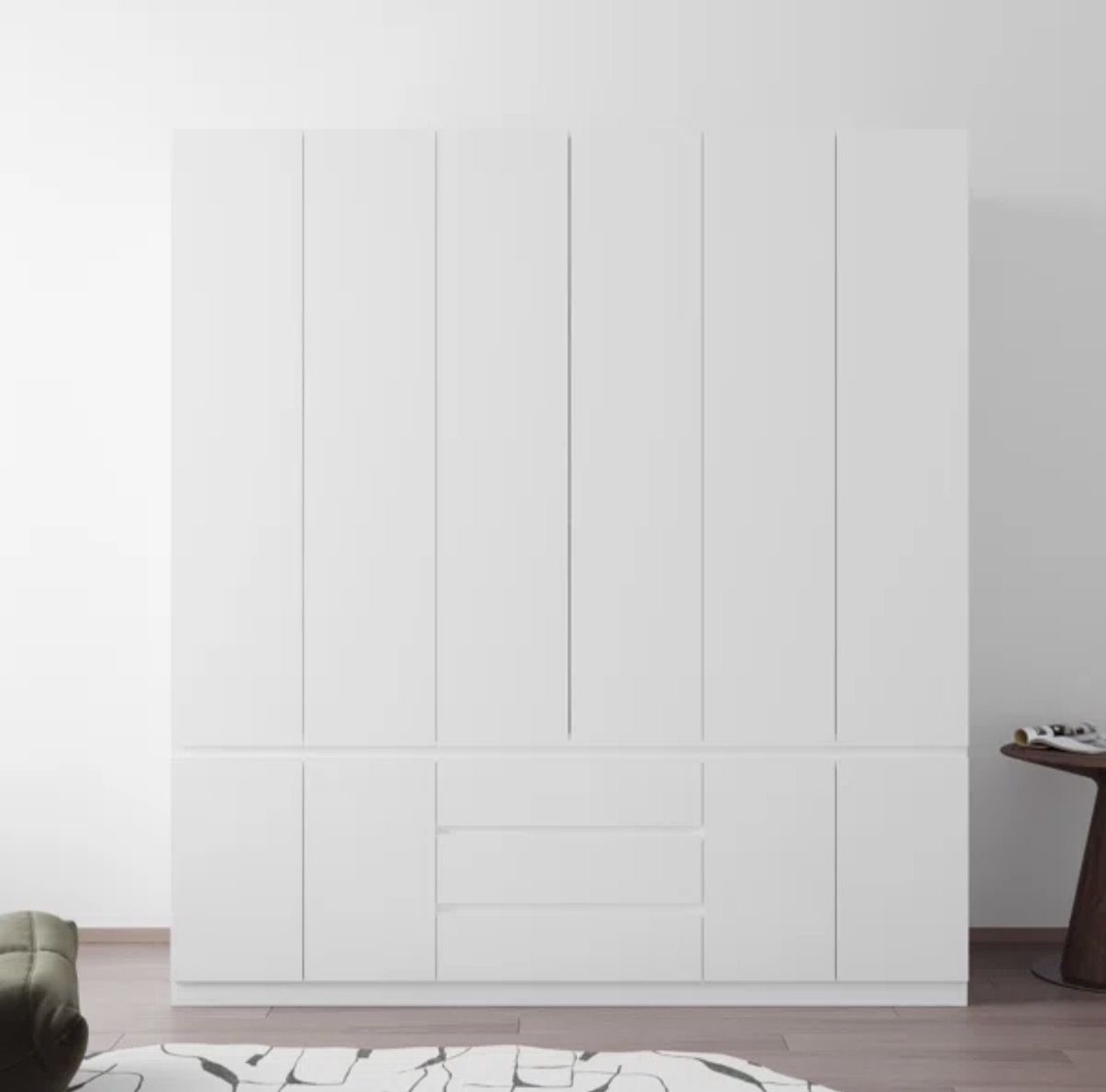Overall Dimensions 78" H X 70.9" W X 24.33" D Overall Product Weight 300lb. Summary This white wardrobe combines modern style with impeccable craftsmanship and durable hardware, refreshing your bedroom and enhancing your space. Featuring a sleek, handle-free design, this wardrobe perfectly complements any home decor while offering a multifunctional storage solution to meet all your needs. This wardrobe is designed with two hanging rods and three shelves to accommodate long dresses and folded garments. The lower section includes three spacious drawers to help organize smaller items, while two large compartments provide ample space for shoes or blankets. Details • Material: Manufactured Wood • Tipover Restraint Device Included: Yes • Assembly Required: Yes FEATURES Door Mechanism Soft Close Number of Doors 10 Clothing Rod Included Yes Shelves Included Yes Drawers Included Yes Drawer Glide Type & Extension Full Extension; Undermount Glides Interlocking Drawers No Mirror Included No MATERIAL Manufactured Wood Clothing Rod Weight Capacity 35 Shelf Weight Capacity 50 Tipover Restraint Device Included Yes Main Wood Joinery Method Cam Bolt Product Care Spot clean with dry cloth Finish Natural Manufactured Wood Type MDF Interior Shelves Included Yes Door Design Insulated Drawer Safety Stop Yes Drawer Location Exterior