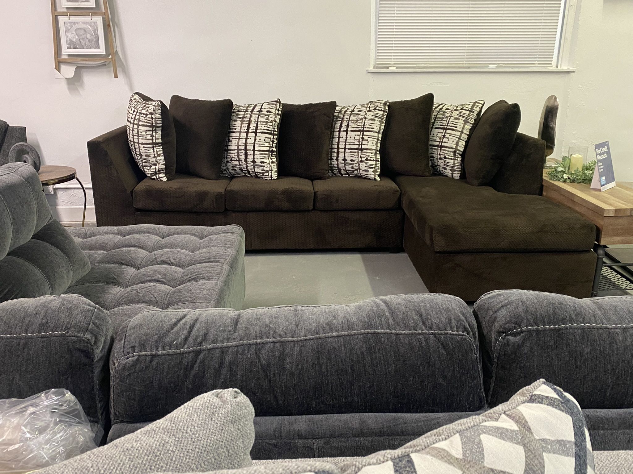Brown sectional with designed pillows¡¡NEW!! ‼️Take it home with only $39 easy approval ‼️ 100 days same as cash no interest Come pick up or ask for delivery 🚚 Completamente nuevos Ven por el o pregunta por tu entrega 🚚