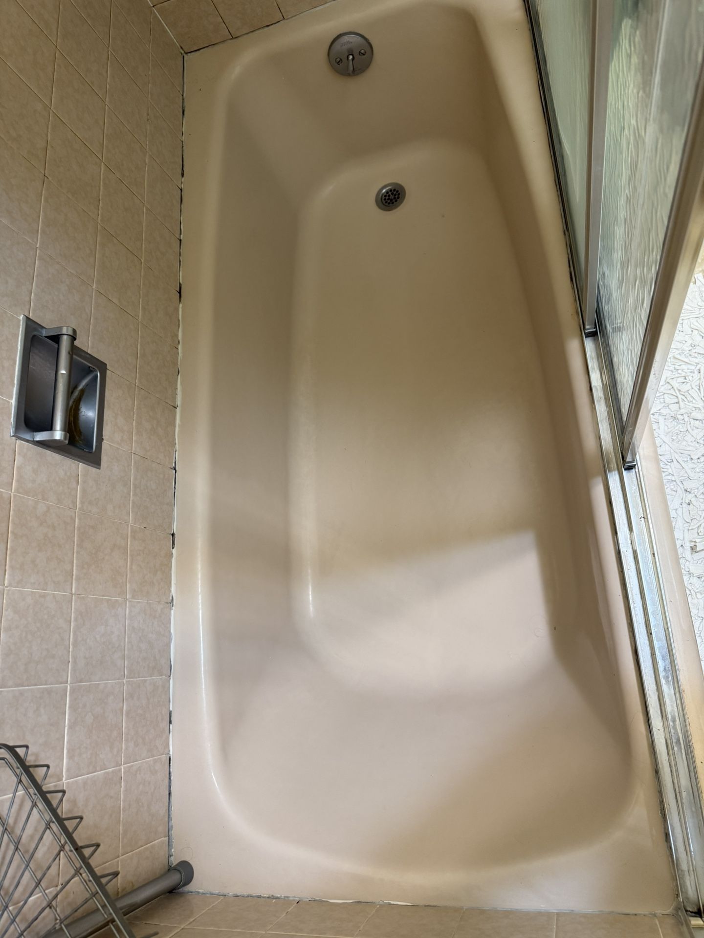 Tub is in great condition, no chips. Toilet seat is not original and toilet has big chip under toilet seat, can only see when lid and seat are both up. Tub is the same color as the main part of the toilet (pink) but not coming through very well in the pictures. Best offer