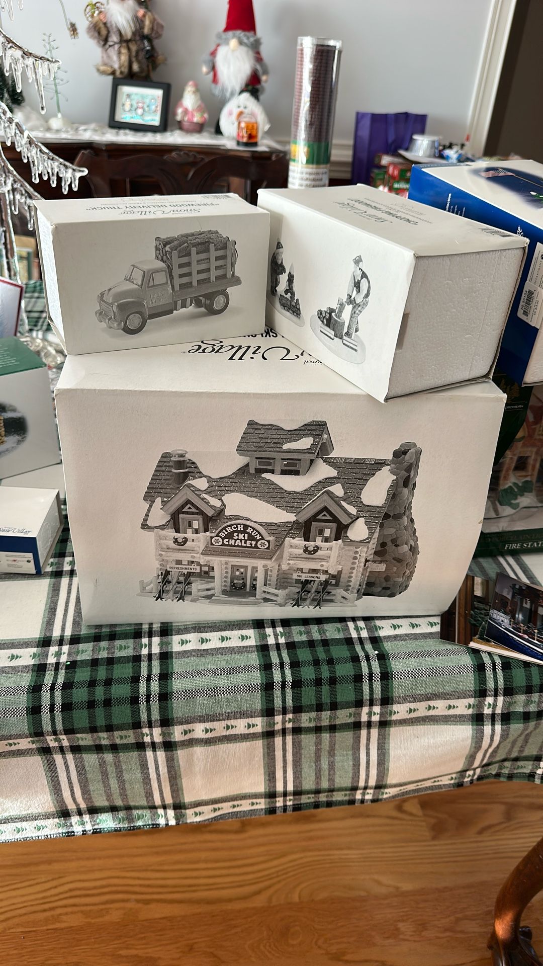 Department 56 Snow Village Burtch run ski house With chopping firewood, figurines, and firewood delivery truck