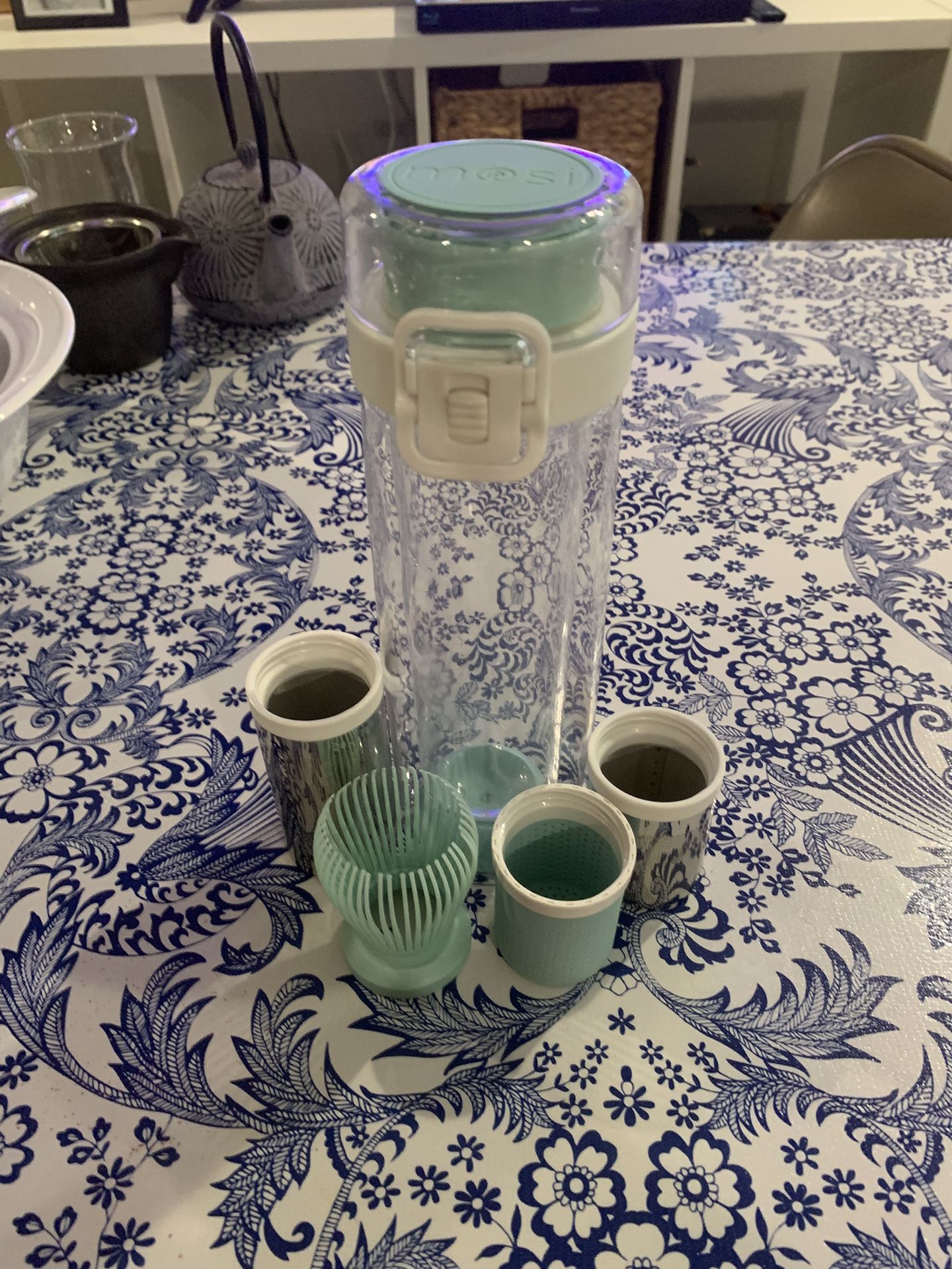 A slim double walled (no sweat), lightweight plastic water bottle, with features like a lock feature and changeable attachments included a silicone tea sieve, 2 different sized metal ones and a matcha whisk. Barely used and dishwasher safe.