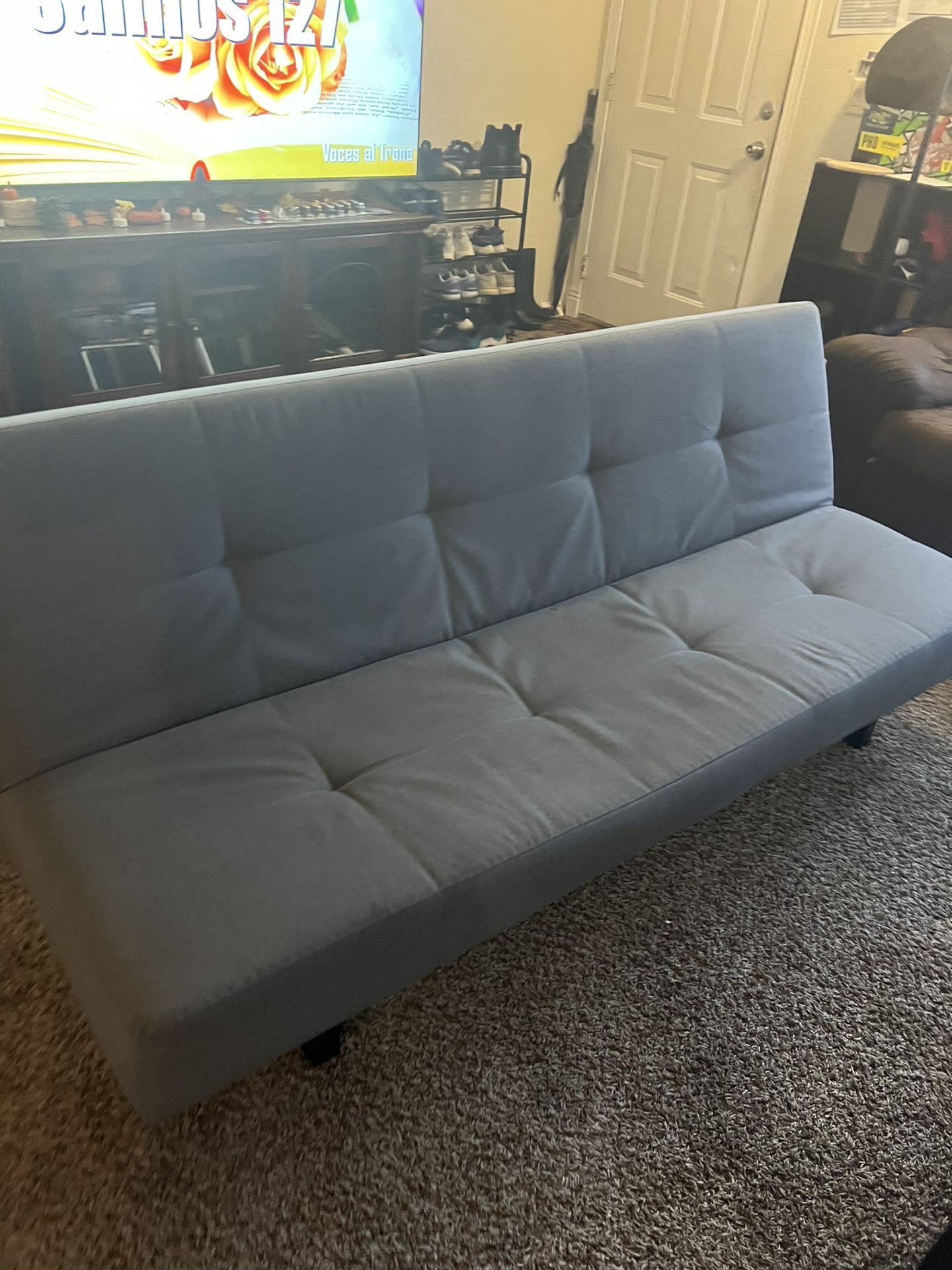 Used IKEA BALKARP futon in gray. It's a simple, compact futon-style couch that folds down into a bed. The fabric is a neutral gray, and it's been used but still has plenty of life left. Great for small spaces or as an extra bed for guests.