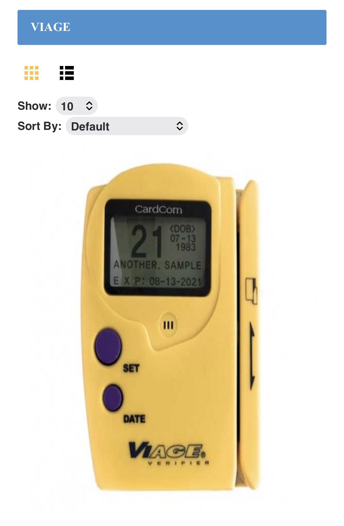 The device in the image is a CardCom ViAge CAV-2000 series handheld ID verifier. This model is designed for age verification by reading magnetic stripes on driver's licenses and ID cards.