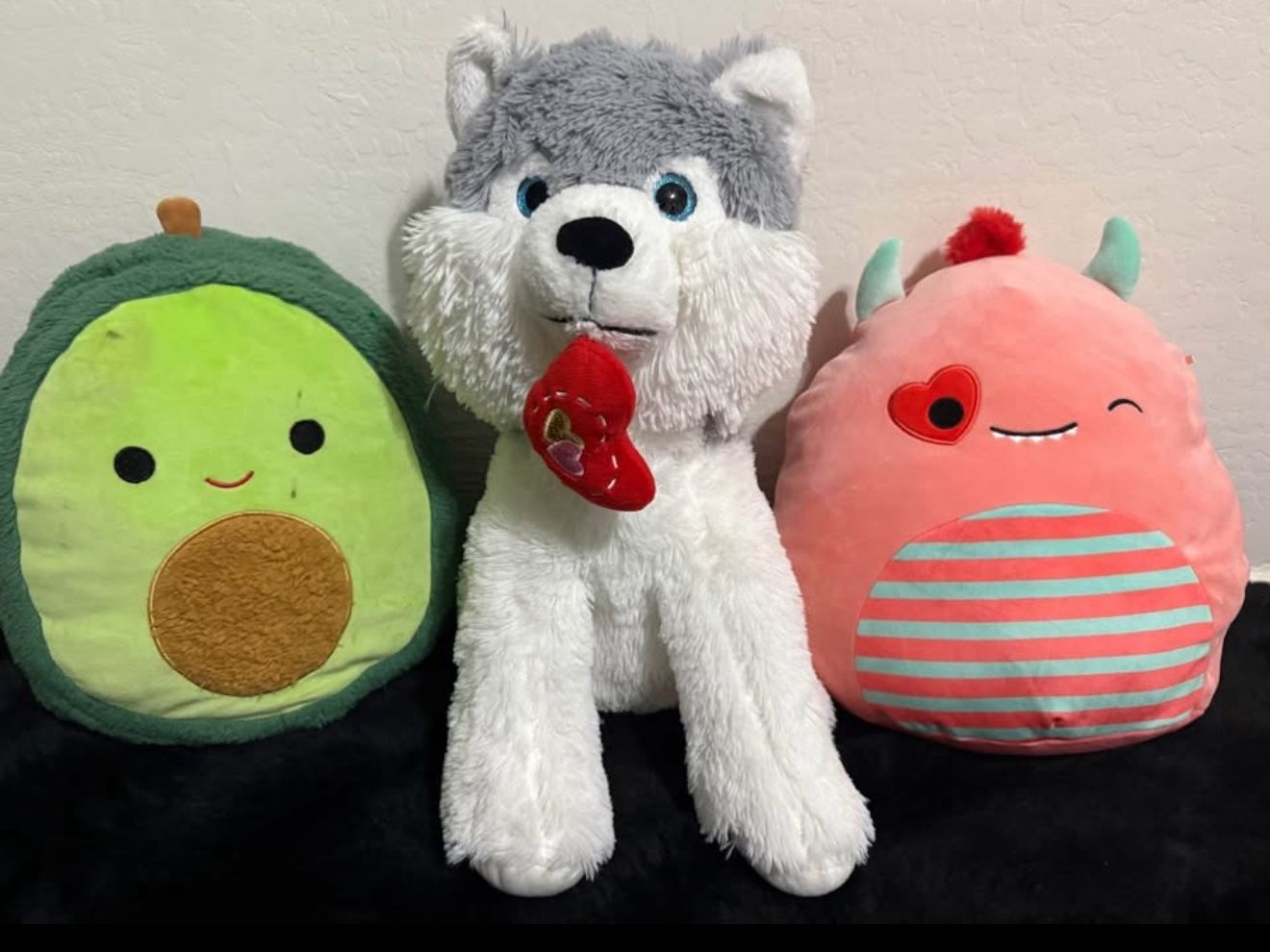 Avocado squishmellow (has stains on face look at pic to see & without tag) Dog holding the heart (no stains) Willett (New no tag)