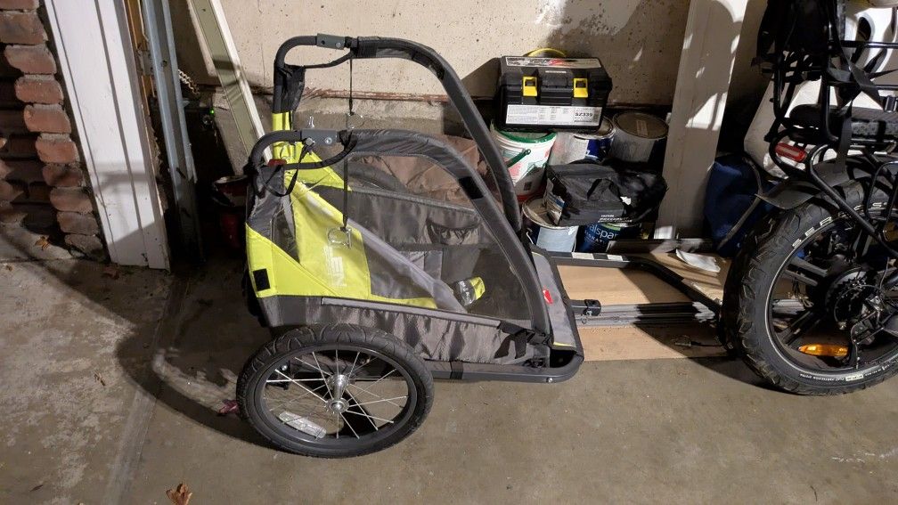 Bike trailer for kids or personal belongings.