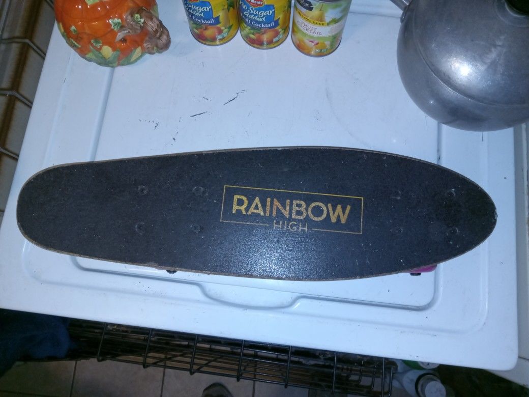 I will not respond to "is it available?" The listing will be deleted once sold. Kids skateboard. 21" in length Rainbow High characters featured on the bottom. $10
