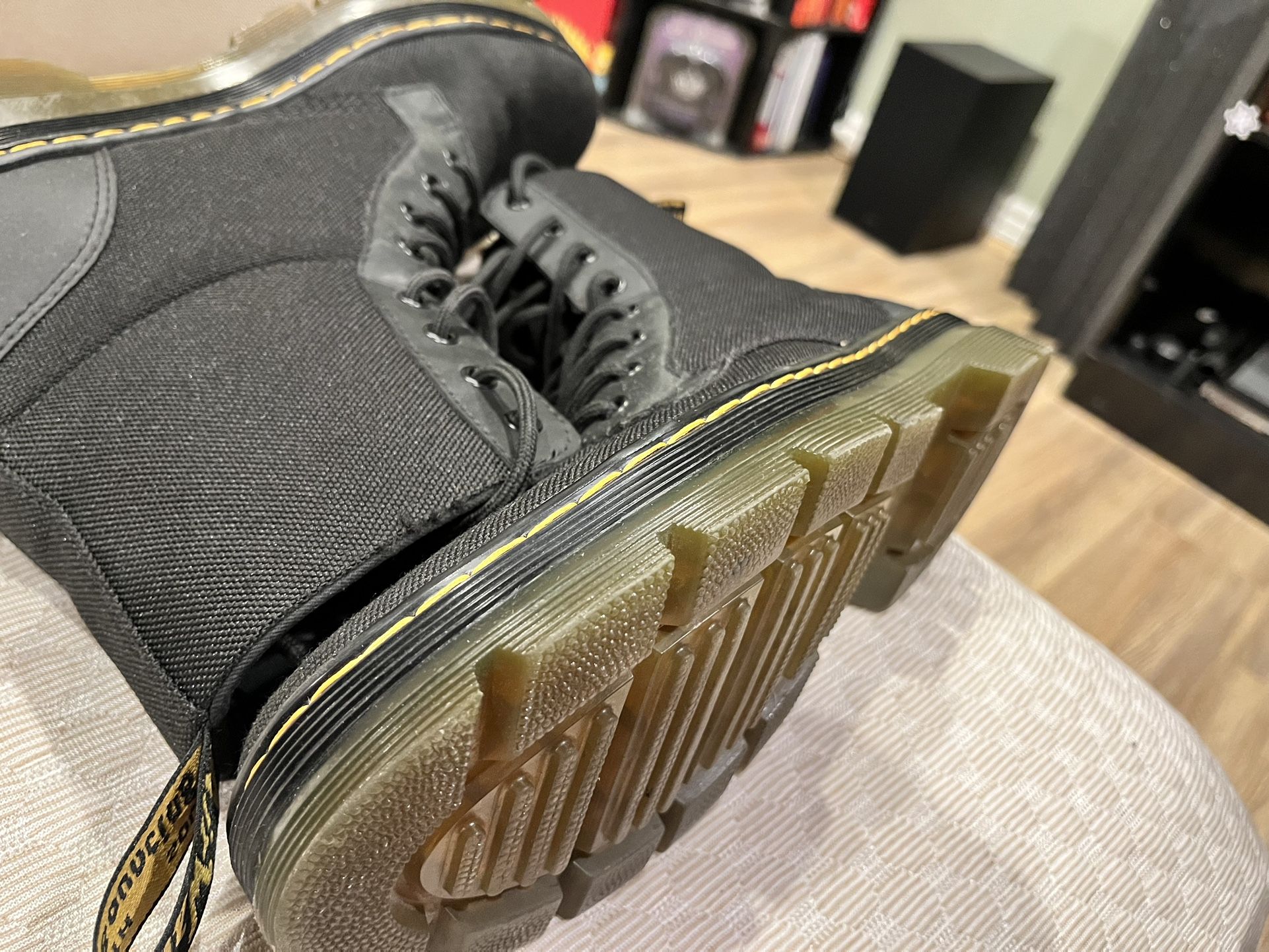 Synthetic material no leather. Almost new, Worn 2/3 times and I went a size down. Also includes the air Cush insoles bought separately. Men’s size 12 us