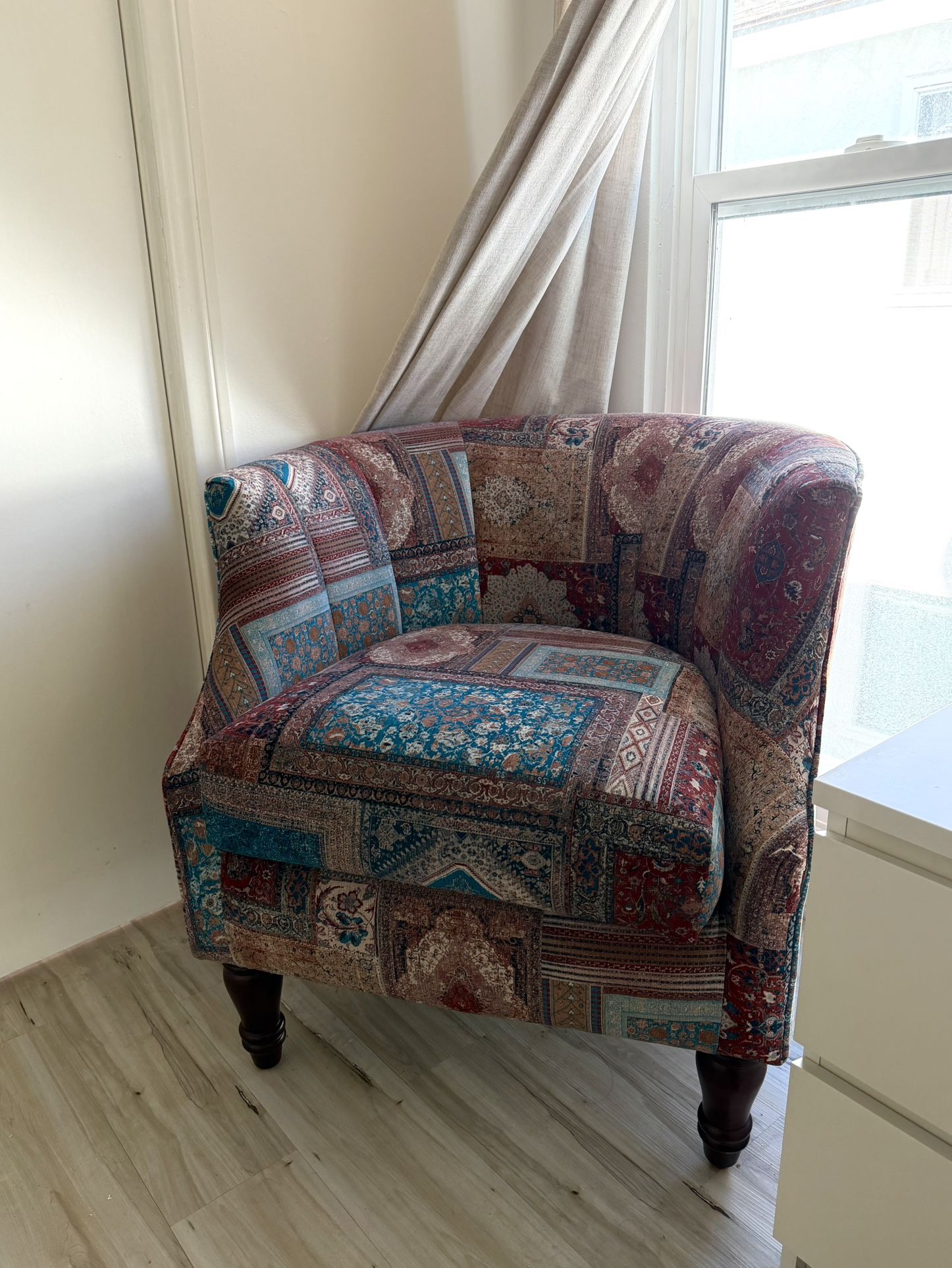 Really unique and comfy accent chair! Has minor scratch on arm (see photo). Pick up only please.