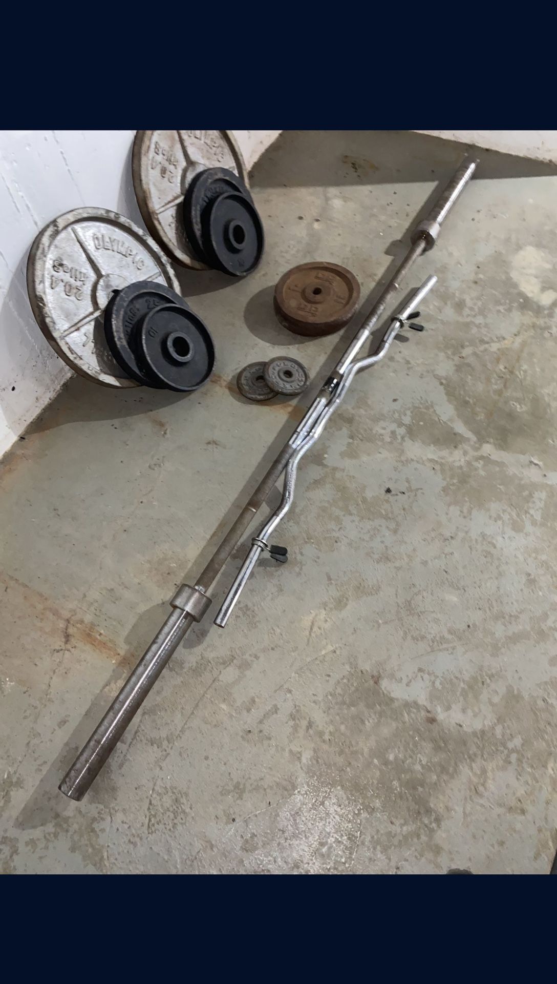 Olympic Pairs of 45, 25, and 10 lbs plates with 7ft olympic 45lb barbell and 1 inch curl bar with clips and 13 and 3lb 1 inch plates. Make me an offer