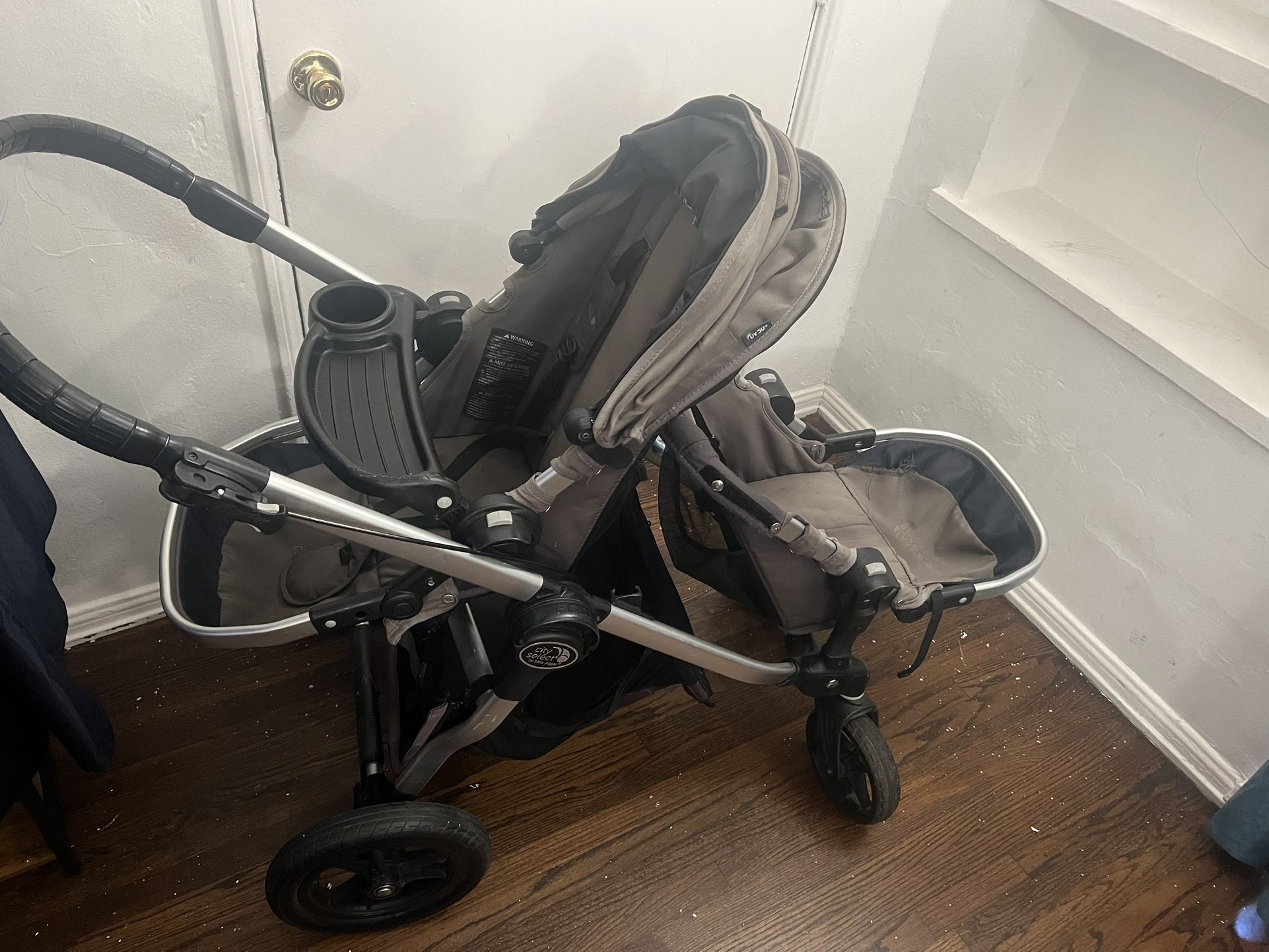 Stroller comes with only one sun/rain shade. Some fabric damage on the stroller seats. Negotiable on the price.