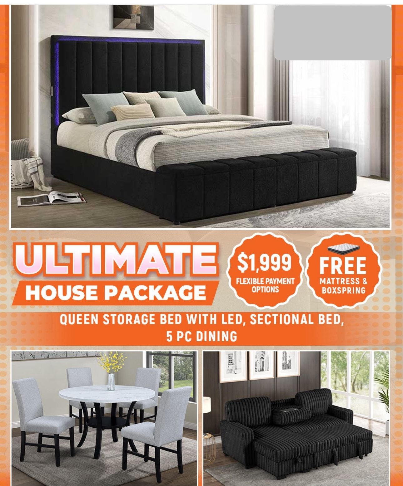 NEW 3 ROOM PACKAGE DEAL- BED MATTRESS DINING ROOM SECTIONAL SOFA AND MORE