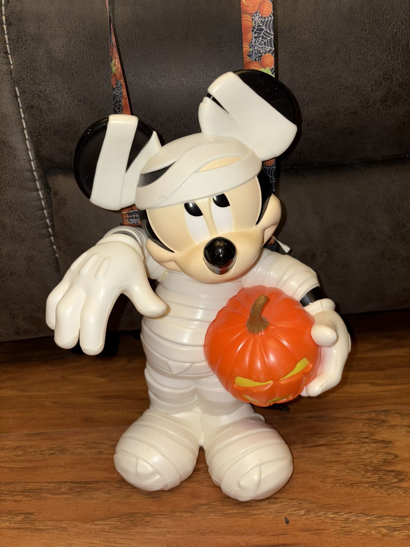Get ready for some spooky fun with this adorable Mickey Mouse mummy figure! Dressed in a ghostly white wrap with classic black ears, Mickey is all set for Halloween with his jack-o'-lantern in hand. Perfect for adding a touch of Disney magic to your holiday decor, this collectible figure is a must-have for any Mickey fan great for storing snacks in the back or even drink.