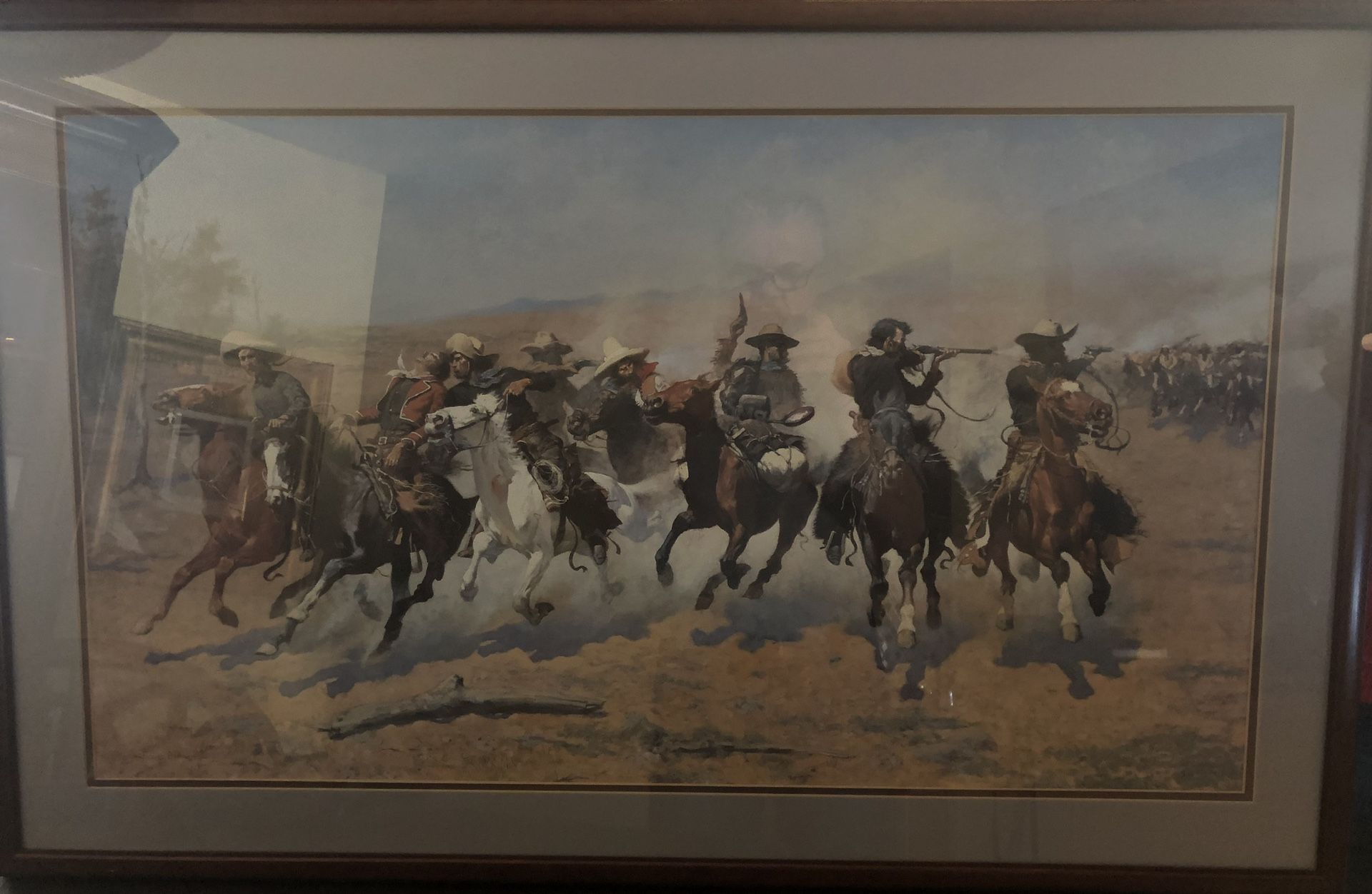 Large framed print. Depicts cowboys riding horses. Western scene. Dusty landscape. Brown wooden frame. Ready to hang.
