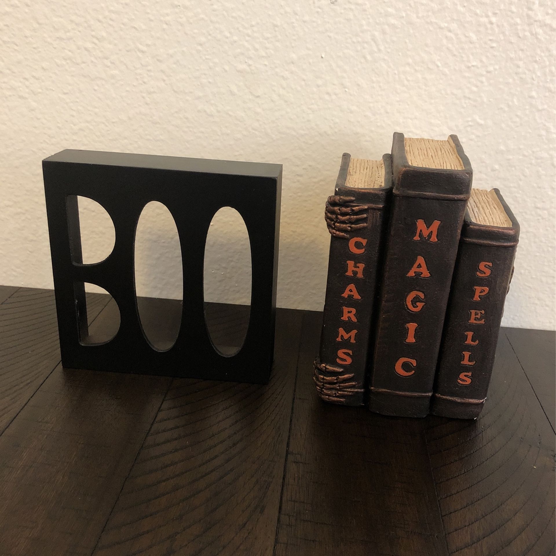 These decorations are in like-new condition. They have only been set out as decorations one year, and have otherwise been in storage. The “BOO” sign is 7” tall, 6 1/2” wide, and 2” deep. The spell books are 7 1/2” tall (at the top of the magic book), 5” wide, and 5” deep.