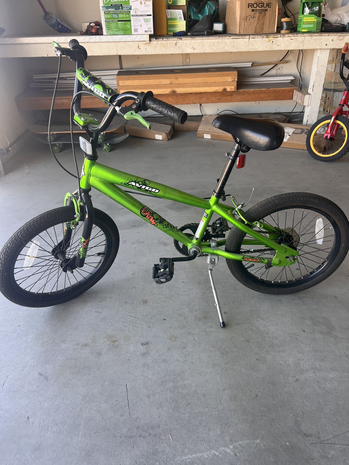 It's a BMX-style bicycle designed for young riders. Features include a quick-adjust seat mast, four-bolt stem, and color-coordinated front pegs. Suitable for children, likely in the 7-9 age range. It has 18-inch wheels and a sturdy frame.