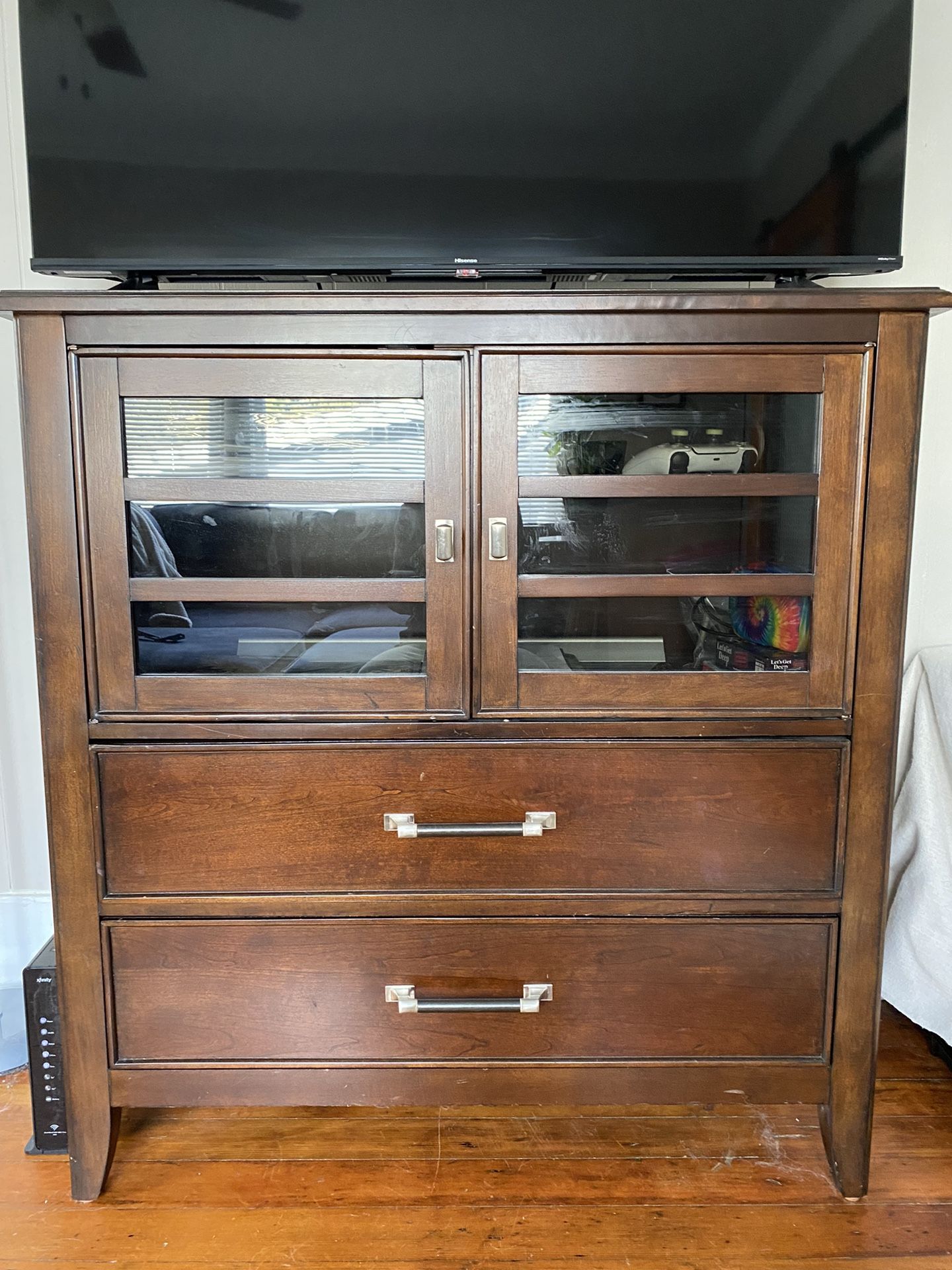 Great TV stand, cabinet with two inner shelves and drawers for storage. Cutout for cables in the back. It had a few scratches that could be buffed out or stained, but no extensive damage. Made of real wood so it’s very sturdy. Measurements in the pictures. Pickup in Snoqualmie (can help you load it) and cash/Venmo only.