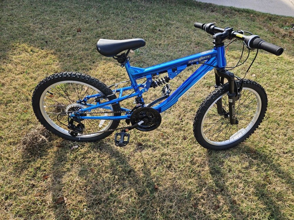 Used. Retails around $350. Take on the mountains at your on pace on the Ozone 500 Boys' Exhilarate 20 in 18-Speed Mountain Bike. The 18-speed Shimano rear derailleur with twist grip shifter allows you to navigate different types of terrain, and the alloy rims and larger tires help absorb shock for a comfortable ride. The front and rear V-brakes provide complete stopping power, and the 20-inch steel frame resists wear and tear from the elements. Features and Benefits 20-inch steel frame offers durability 20-inch tires with alloy rims Front and rear V-brakes ensure reliable stopping 18-speed Shimano rear derailleur with twist shifter delivers swift and smooth shifting Steel fork helps it last for years Dual suspension Padded seat provides a comfortable seat for extended rides Integrated kickstand Recommended for ages 7 to 14