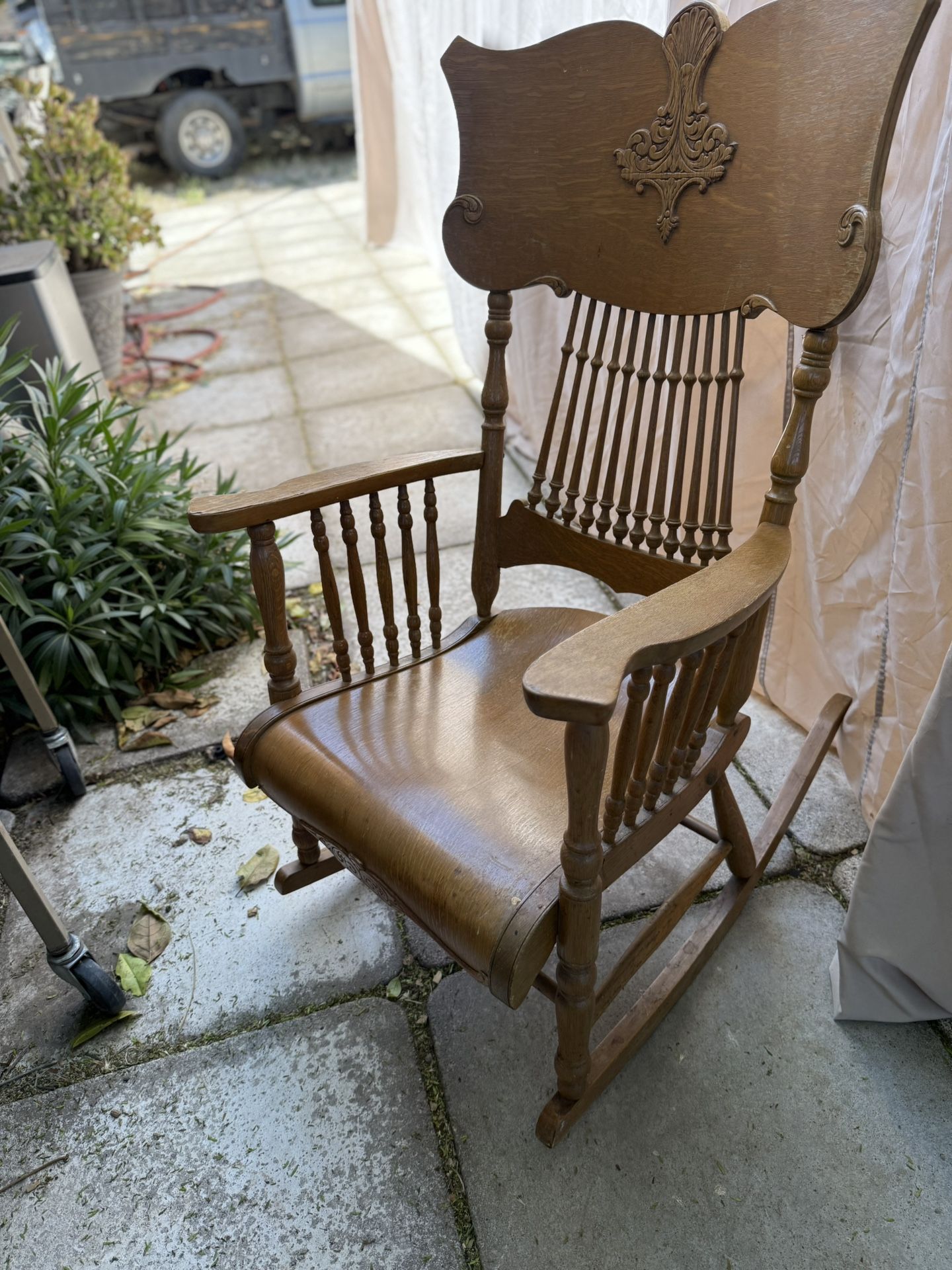 Beautiful vintage oak rocking chair with carved decorative details and spindle back. Sturdy and comfortable, perfect for a reading nook, nursery, or rustic accent piece. Light wear consistent with age. Local pickup only.