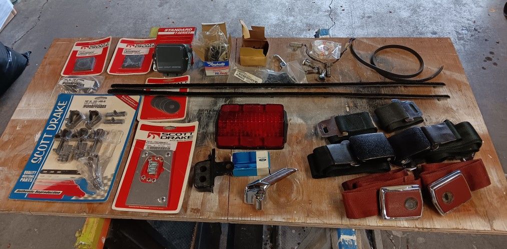Misc collection of odds and ends from several Mustang projects. Most parts are brand new. The seatbelts are obviously used. The black is a full set that could be used front or rear. The red ones are buckle side only. But all work properly and webbing is not ripped or torn. SELLING AS ONE LOT. Look closely at the pics, most of these parts could fit several years. The tail light lense is original and used, but in excellent cond and fits '65-'66. Please no calls about fitment or if I have others parts. Thanks.