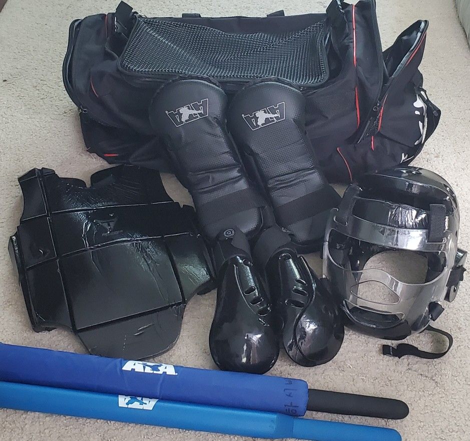 Full protective gear for martial arts training or tournaments. Includes: Headgear with face shield Chest protector Shin guards Forearm guards Foot protectors Two padded sticks Carrying bag Brand: ATA (American Taekwondo Association) All items are in excellent condition. Ideal for students, beginners, or sparring practice.