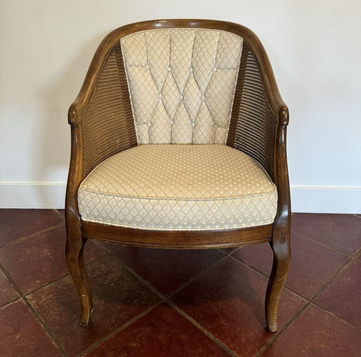 This Vintage Chaircraft Chair is in great vintage condition Woven rattan sides Fabric has no tears Minor flaws as shown in photos Back of chair is 32 1/2” tall Seat is 22” wide Pickup is in Tempe