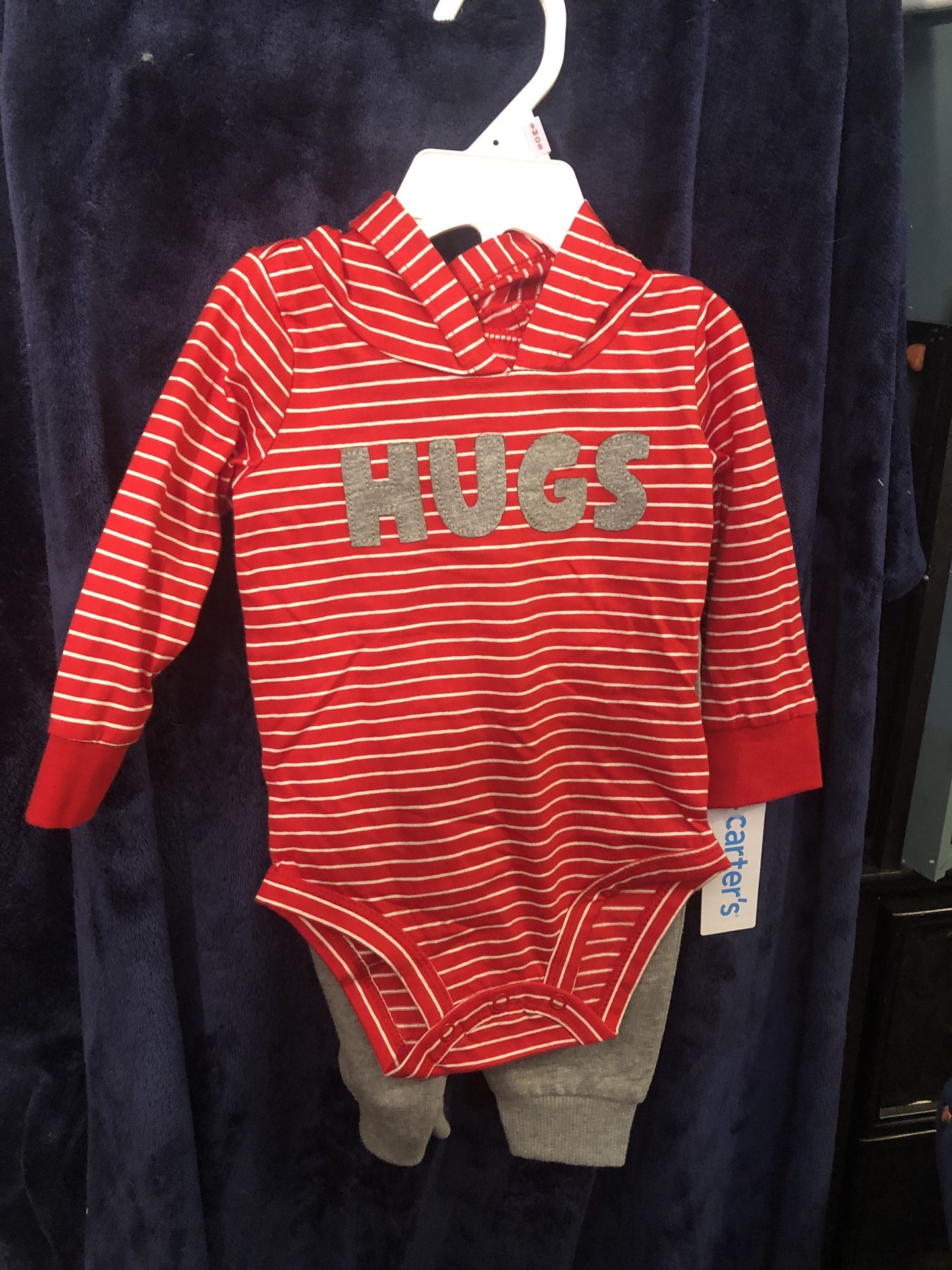 Carters brand 2 piece, long sleeve and pants outfit. Cute shirt says”Hugs” on the front. Brand new with tags. Size 9 months.