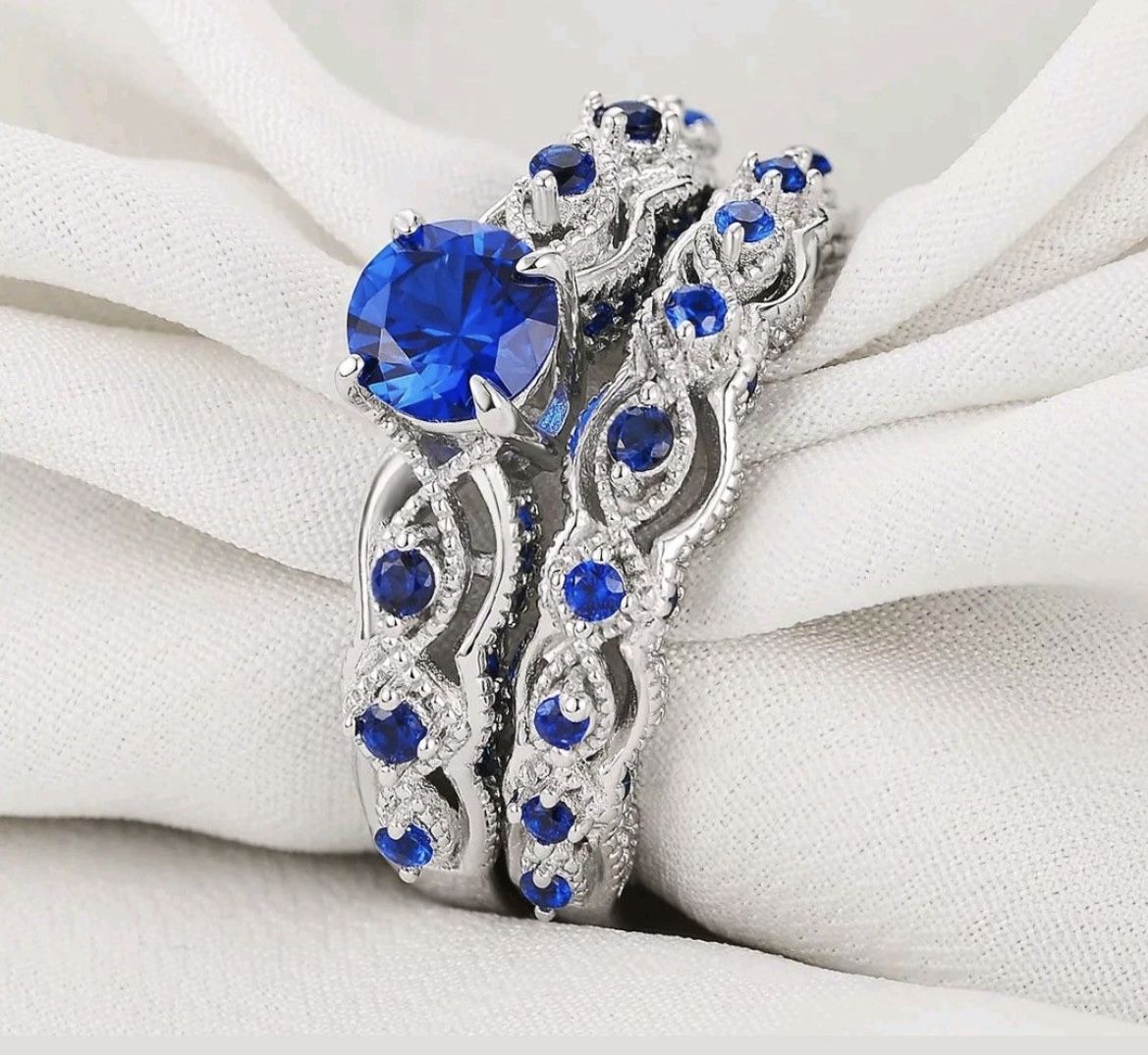Women's beautiful 2 piece AAA grade cubic zirconia wedding set. Crafted from 925 solid sterling silver,the center of ring showcases one round cut 6mm AAA grade created blue sapphire, surrounded by 38 smaller round stones down the sides. The matching band features 17 matching round blue stones in a pave setting. Top quality stones display amazing enriched clarity just like real diamond! ONLY AVAILABLE IN SIZE 7 Free band for men when you paid the full asking price