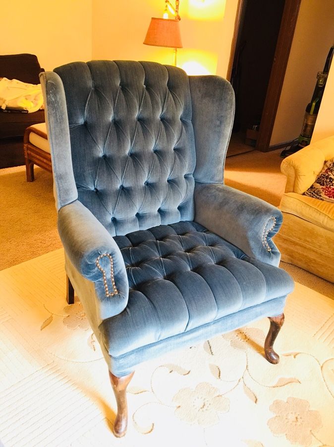 *Royal Chair With An Attractive Navy Blue Color. *Tufted Buttons With Nail Head Designs On The Arms. *Velvet Soft Fabric All Over With Wooden Base Legs. *Huge Wide In Size (Width),Will Look Amazing In Large Rooms Or Areas. *Overall In Excellent Condition Except For A Few Minor Flaws Caused By Movers When Moving It (Check Photos),Other Than That As If No One Ever Used It Very Firm. *Images Were Taken From Different Angles Both Day & Dim Lightening,For A Better Idea How On Would It Look Like (In Person Much More Beautiful And Eye Catching). *Comes From A Super Clean Pet Free/Smoke Free Environment. *$220 Or Best Offer. Thank You,