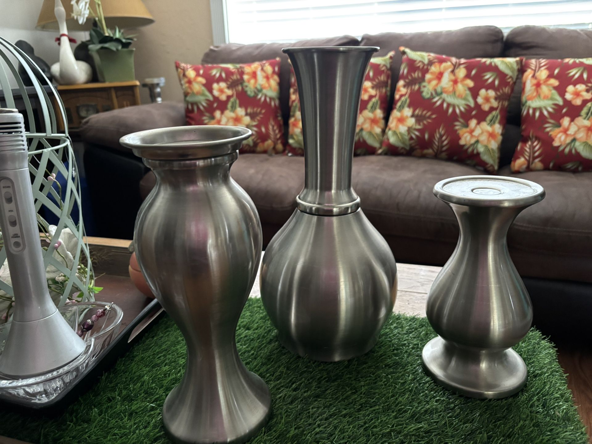 Beautiful stainless steel Vase and Candle sticks. Perfect for formal settings and kitchens.