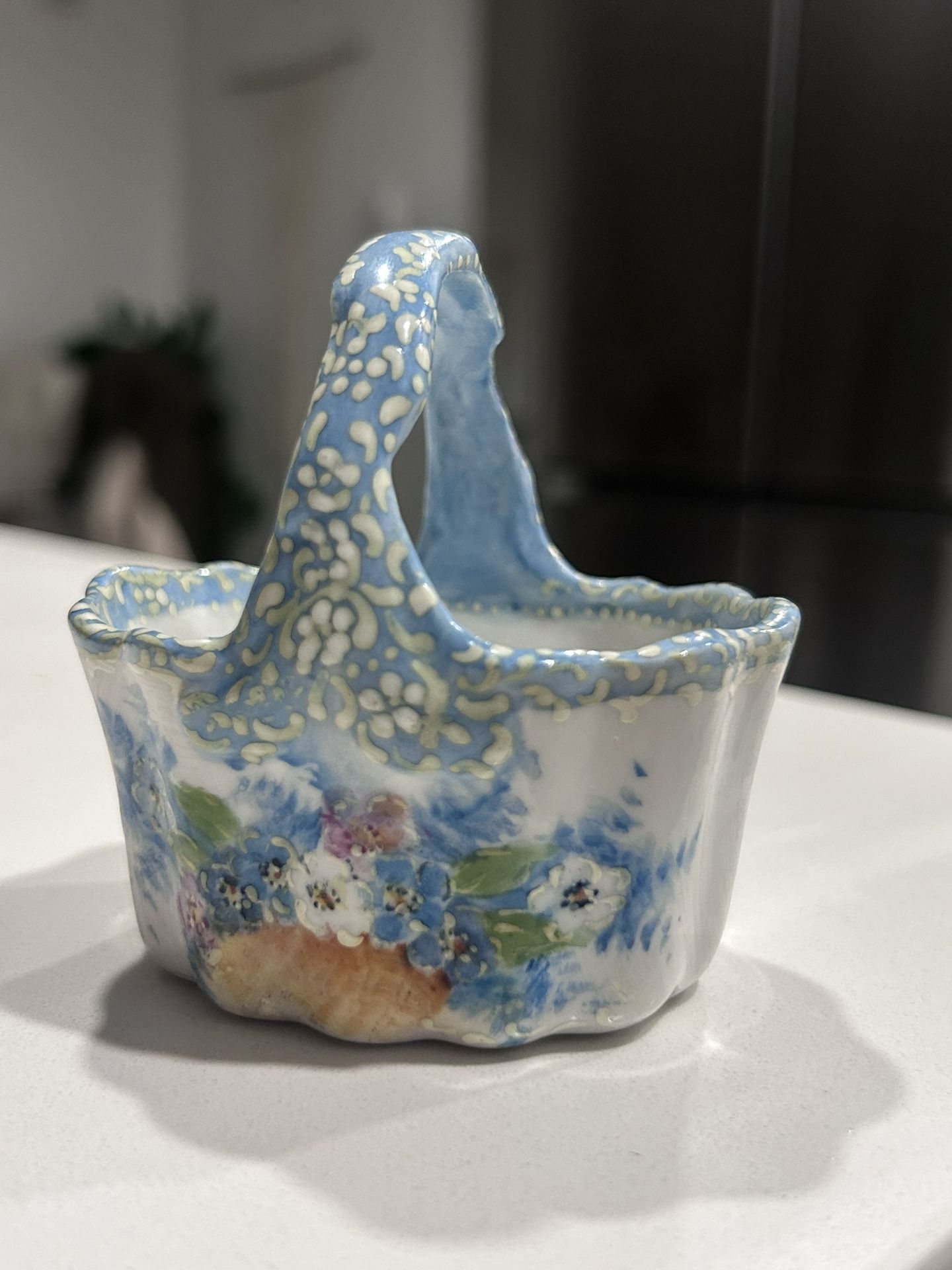 Mini Vintage Hand Painted Ceramic Basket Blue Floral Cottage Decor