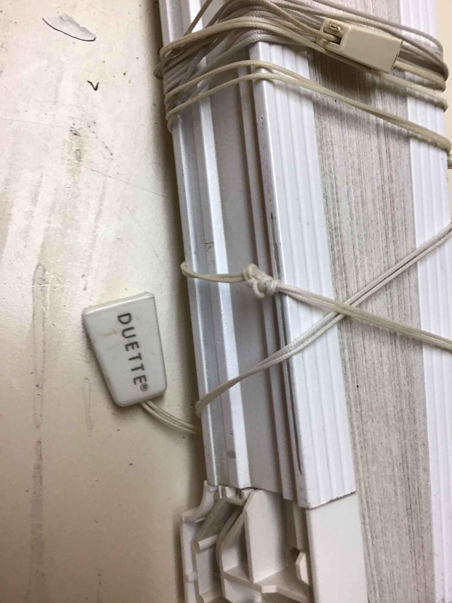 Gray duettee blinds Inside mount. Approximately 57 “ x 46”