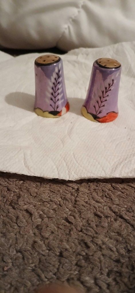 This set is from the 1950s or 1960s. They are ceramic. Made in Japan and hand-painted with a floral pattern. Cork plugs.