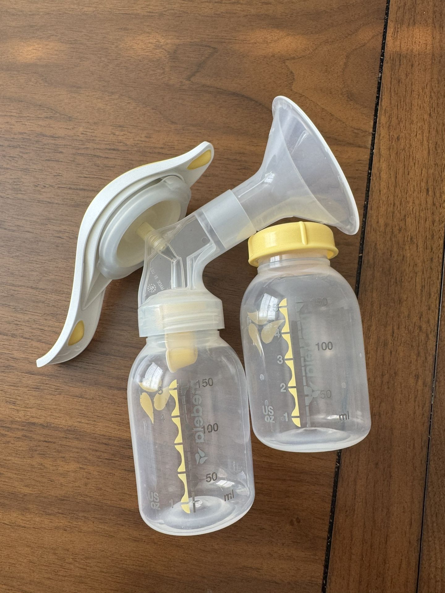 Medela hand pump and two 5 oz bottles with cap. Brand new used a couple times.