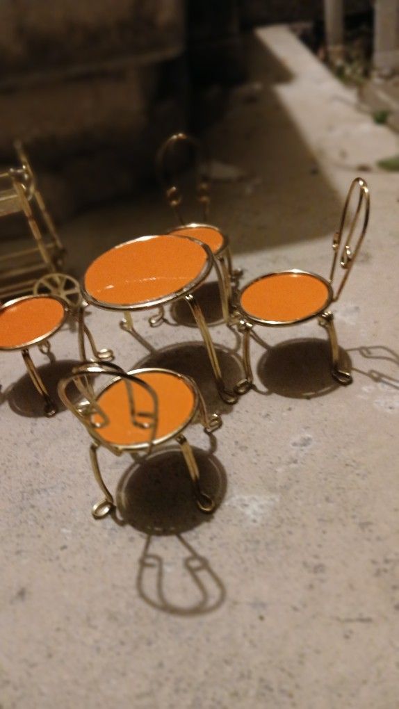 Vintage gold tone bistro set , bar cart, and Wooden table. Barcart is missing 1 wheel.