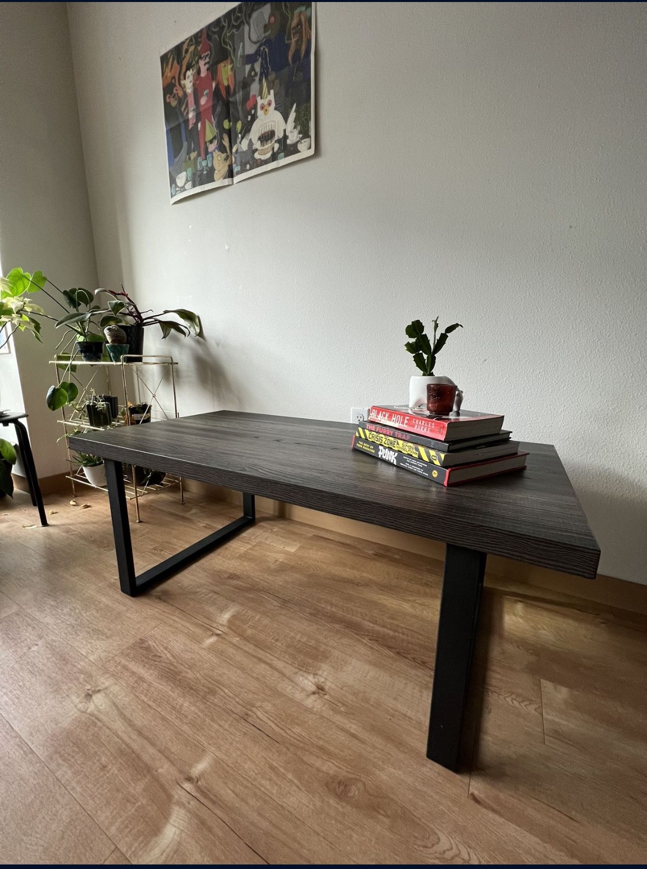 Sleek large coffee table with metal square support. Perfect for living rooms, dens, or a man cave. Mild scuffing and chip, can be fixed with paint and epoxy. Farmhouse, modern, ikea, target, dorm, video games, tv stand, new, apartment, media center, dining, chill, designer, iron, artisan