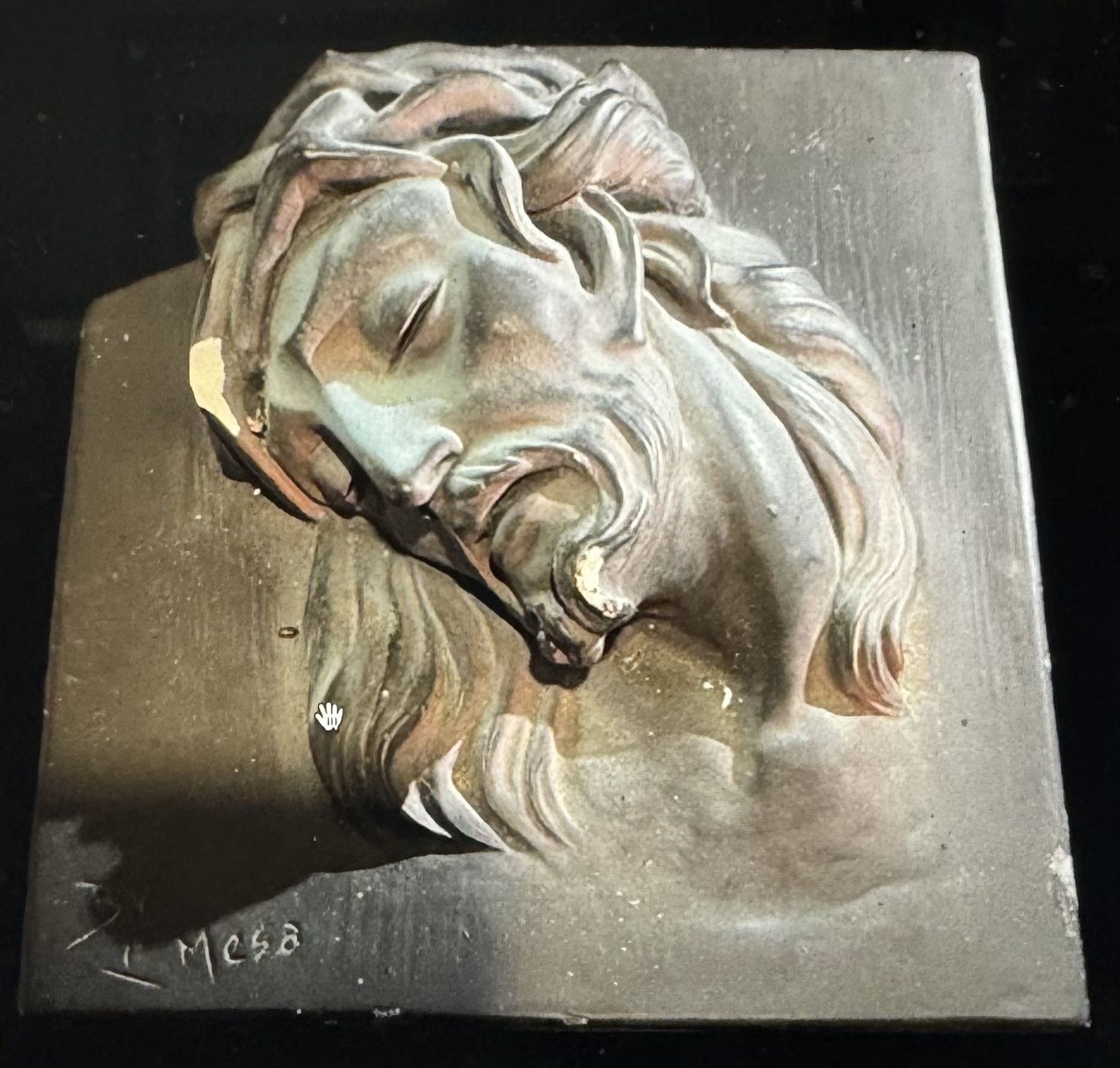 Jesus Christ Carved Head Face Wall Plaque Statue Art by Mesa 7.75 in. H x 7 in. L Eyes closed. Crown of Thorns depiction. Has some chipped pieces. See pictures.